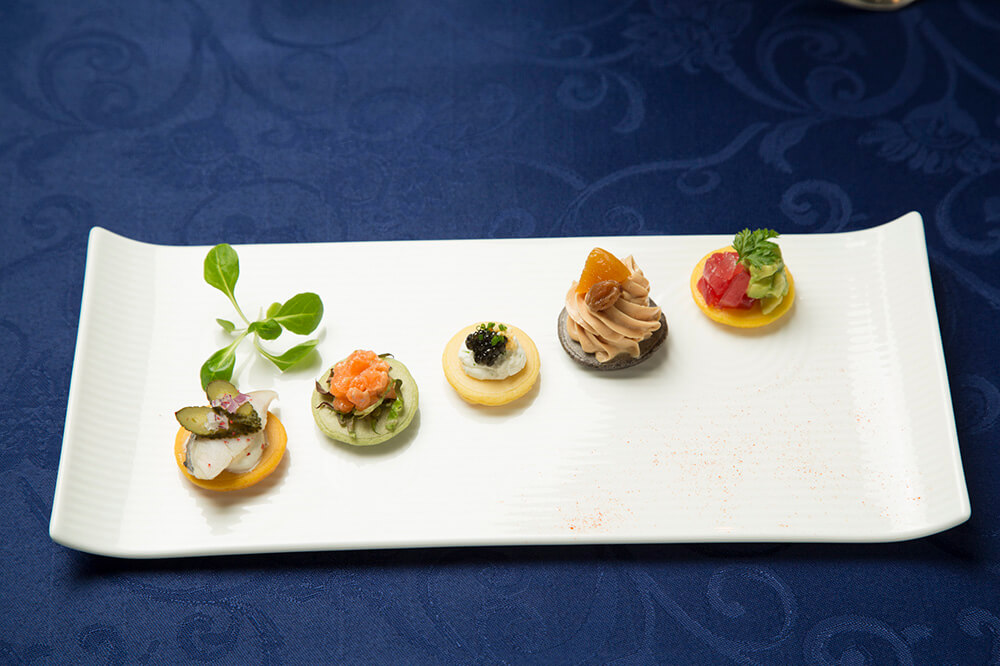 この日のために特別に用意された「モダンブリティッシュ・ディナー」一品目:5種のパンケーキ(左から、ヘリングサラダ、スモークサーモンサラダ、キャビアとサワークリーム、グースレバームース、マグロとアヴォカド)