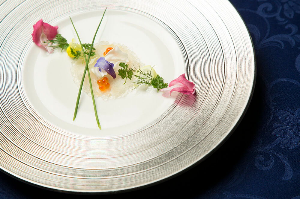 二品目:真鯛のスモークハーブとエディブルフラワーのサラダ仕立て