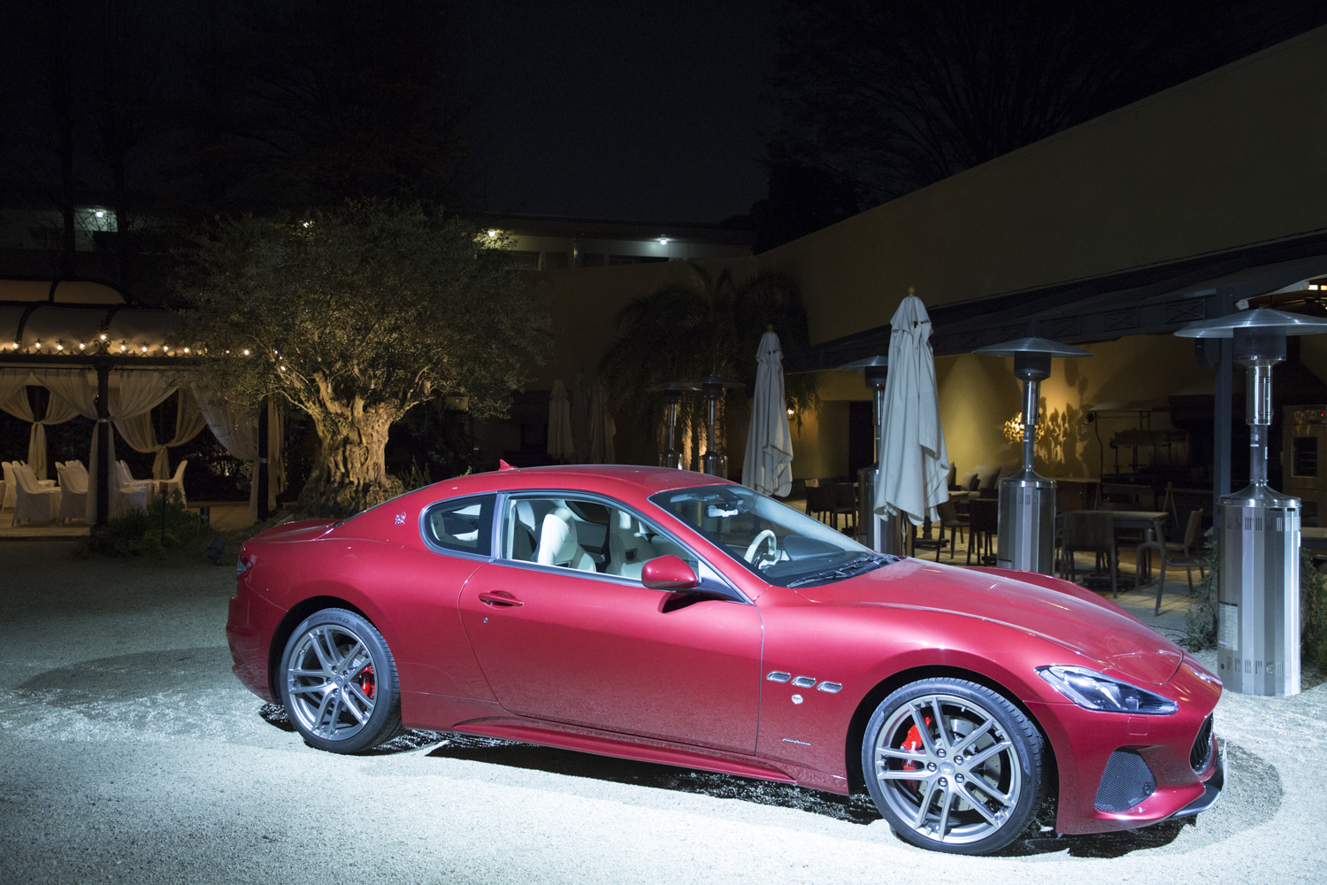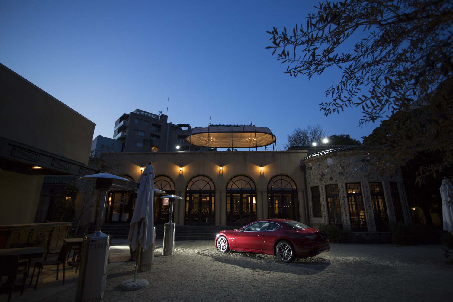 ガーデンには、マセラティのグラントゥーリズモ スポーツの特別展示が。右手の円形部分はシガールーム