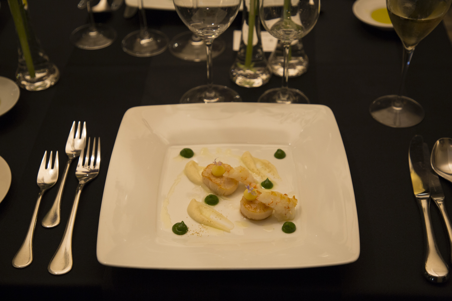 一皿目「帆立貝とシガーらのコンビネーション 根セロリのクレモソ コリアンダーと柑橘のアクセント」