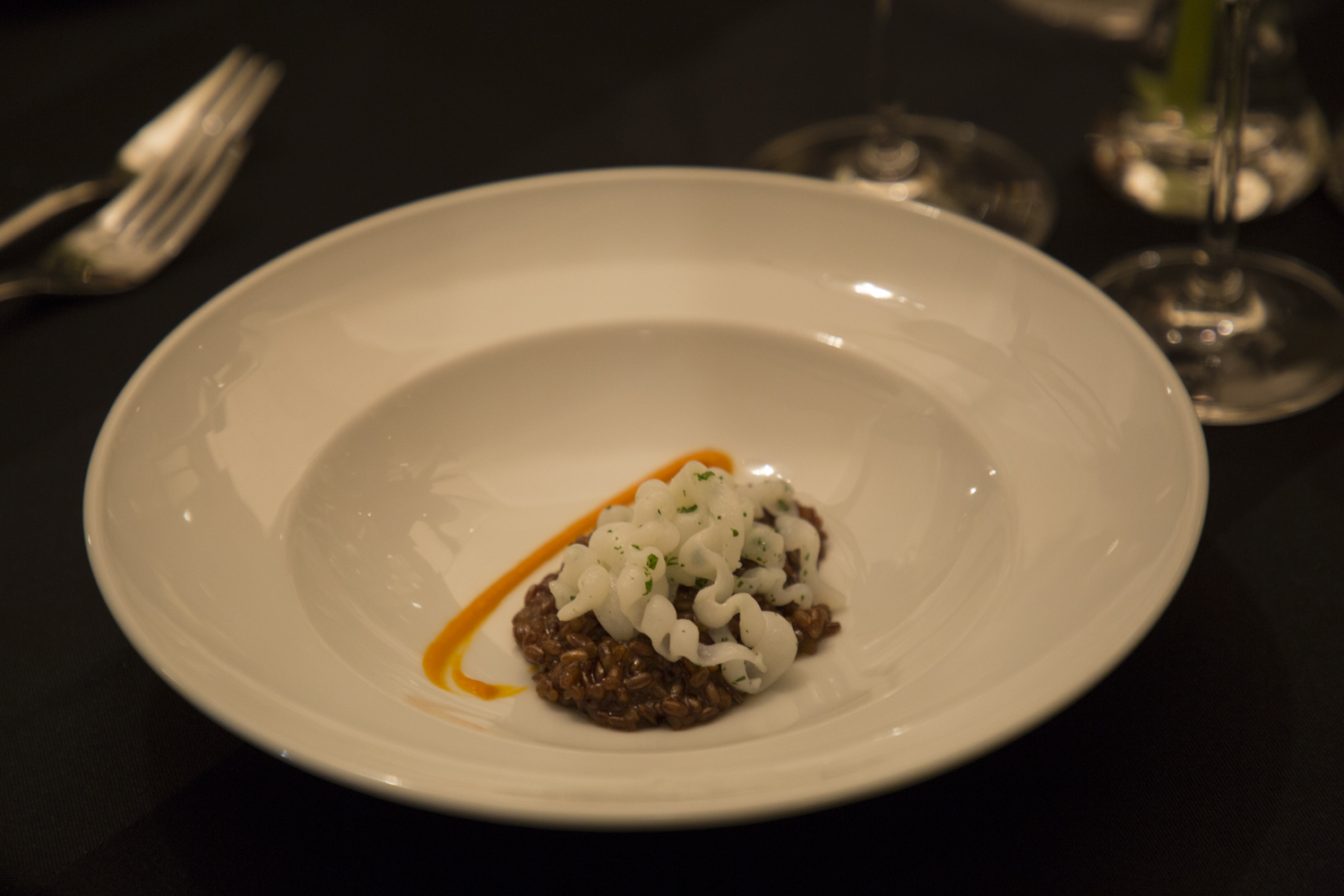 二皿目「アオリイカ ピメントンチョリセロソース 赤米のアロスメロッソ」