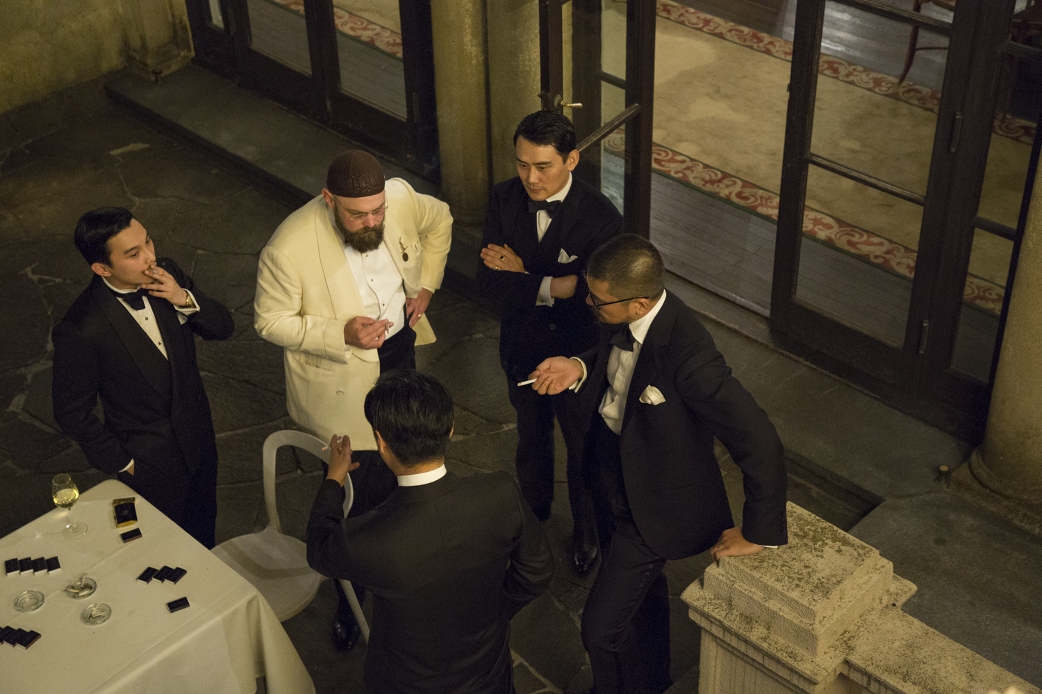 中庭での一服タイム。左上から時計回りに、アタイア ハウスのアーノルド・ウォン氏、ブライスランズのイーサン・ニュートン氏、ミスター・ボタンのカルヴィン・ザン氏、ブリオのジョージ・ワン氏、弊誌副編集長の藤田