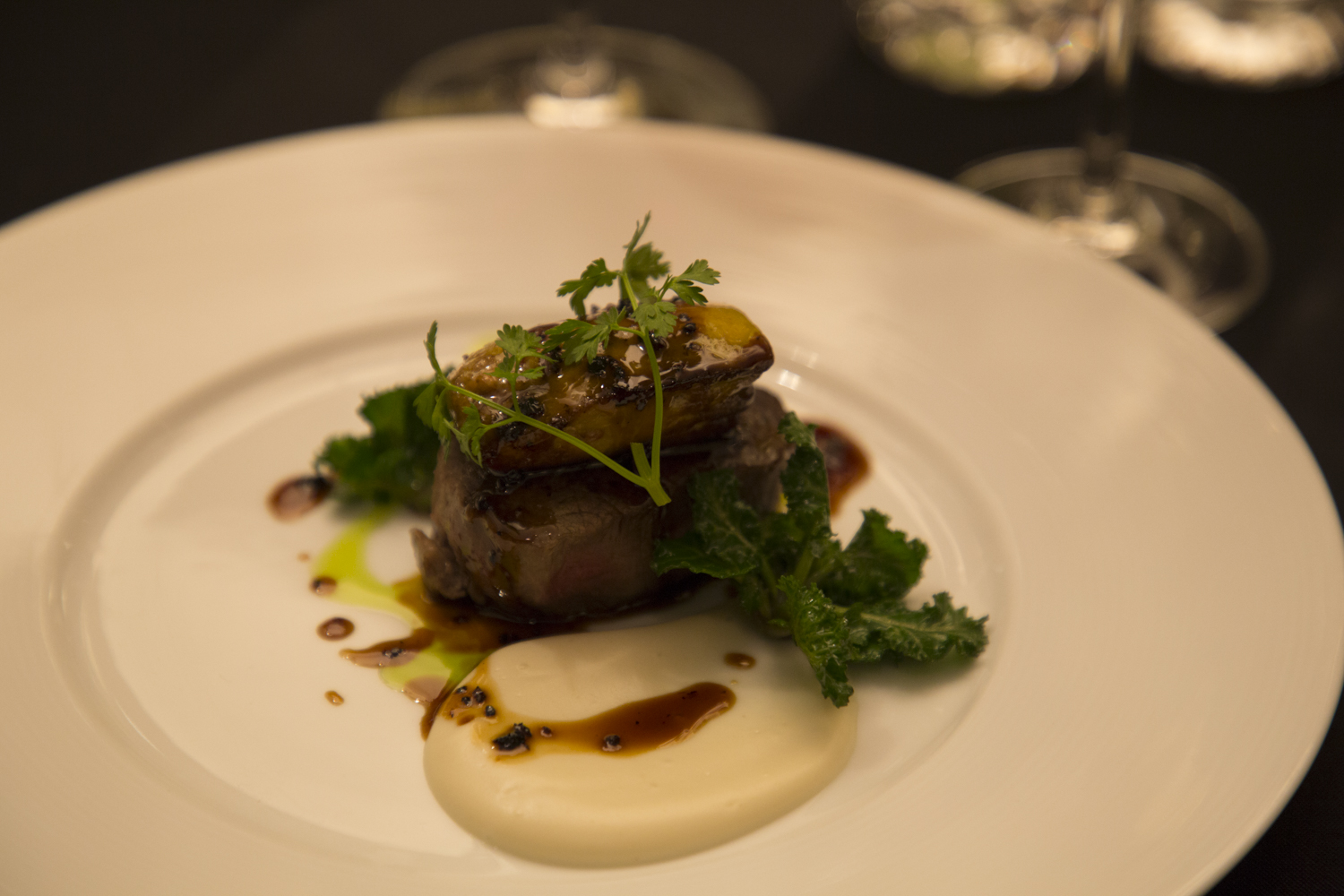 メインの「特選牛フィレ肉 フォアグラ 根菜のピューレ トリュフソース」