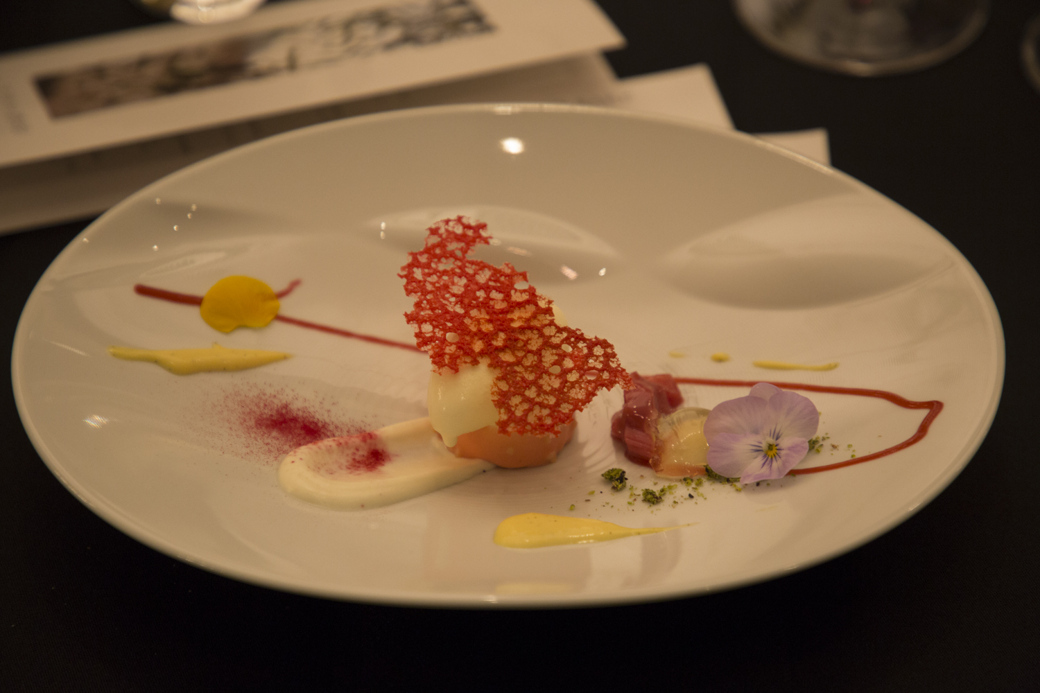 デザートの「ルバーブのコンフィとマスカルポーネムースのアンサンブル ベルベーヌのジュレを添えて」
