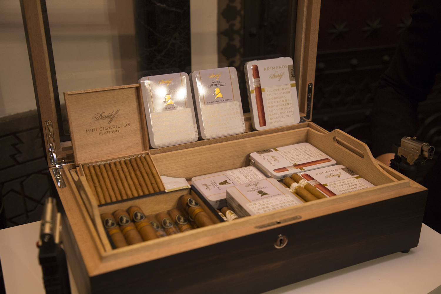ダビドフ社が誇るシガーの数々。「ダビドフ ウィンストン チャーチル レイトアワー ロブスト」をはじめとする数々の芳醇なシガーが揃っていた