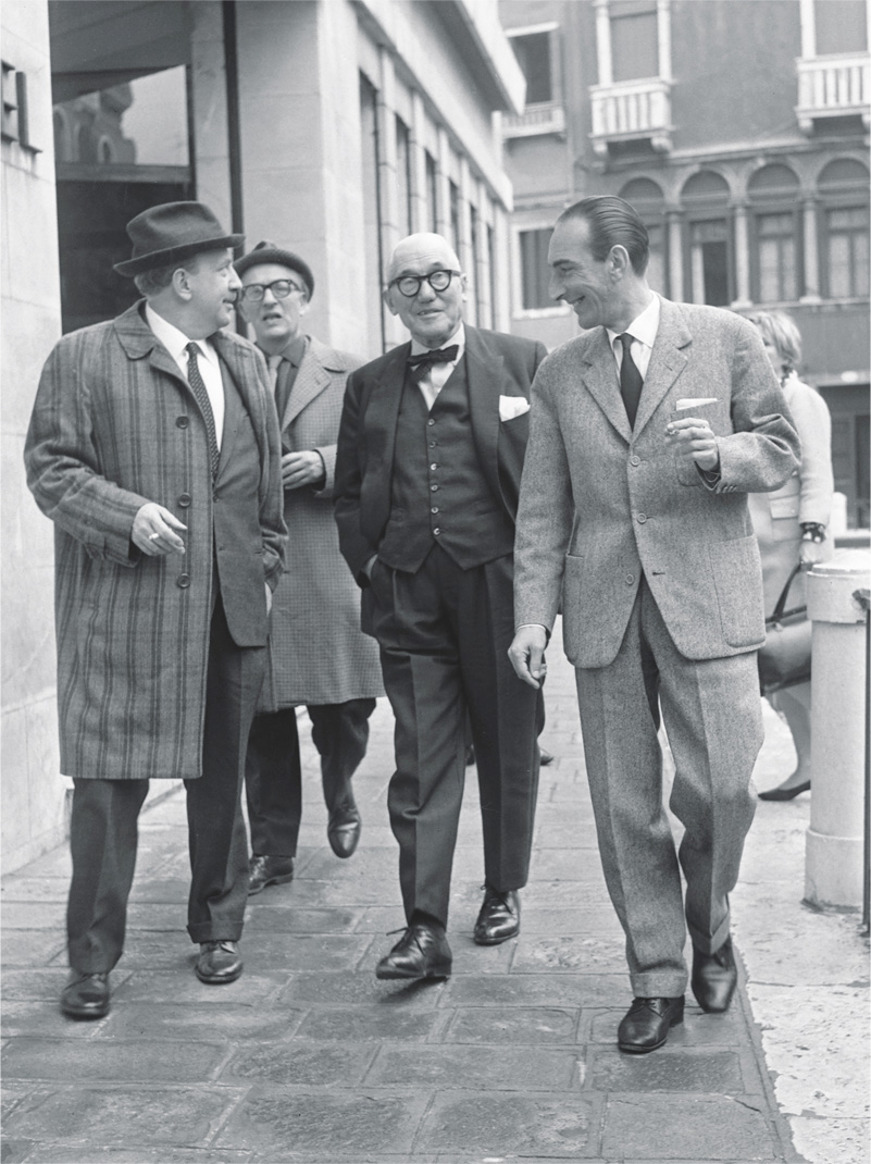 ル・コルビュジエとイタリアの美術史家、ジュゼッペ・マッツァリオール(左端のストライプのコートを着ている人物)。ベネツィアにて(1965年)。