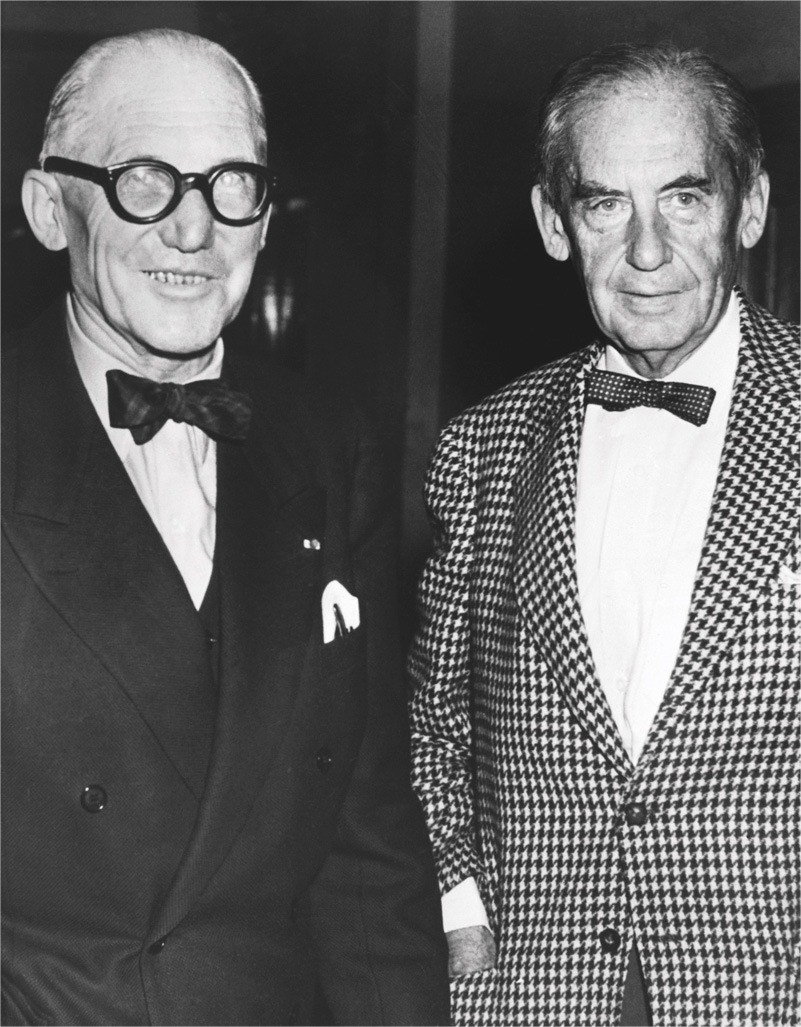 ベルリンで開催された国際建築展の会議に出席した際の、建築家ヴァルター・グロピウスとル・コルビュジエ。