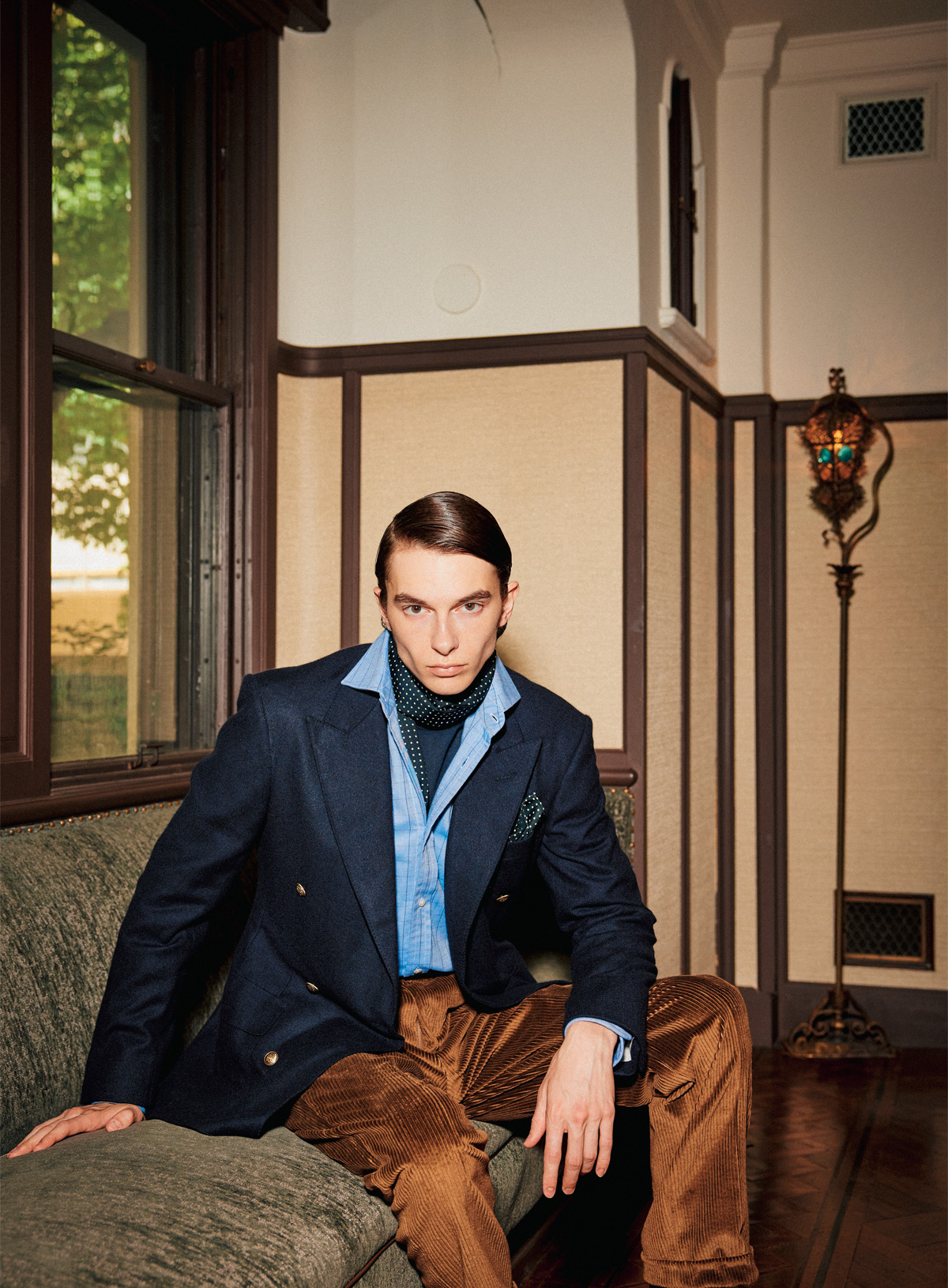 カシミアを軸にしたネイビーブレザーの深化したクラシックカシミアブレザーにコットンカシミアシャツとタートルネックニットを合わせ、さらにコットンカシミアのコーデュロイトラウザーズ。首元のシルクスカーフが、カシミアの静謐な調和にほのかな詩情を添えている。柔らかな質感と端正さが交差する、日常とラグジュアリーの自然な共存。さらに装う者の佇まいをも調和させる、これぞサイモン流のクラシックの深化である。ブレザー ¥636,900、シャツ¥107,800、トラウザーズ¥159,500、ニット、スカーフ、ポケットスクエア すべて参考商品 all by dunhill(ダンヒル TEL.0800-000-0835)