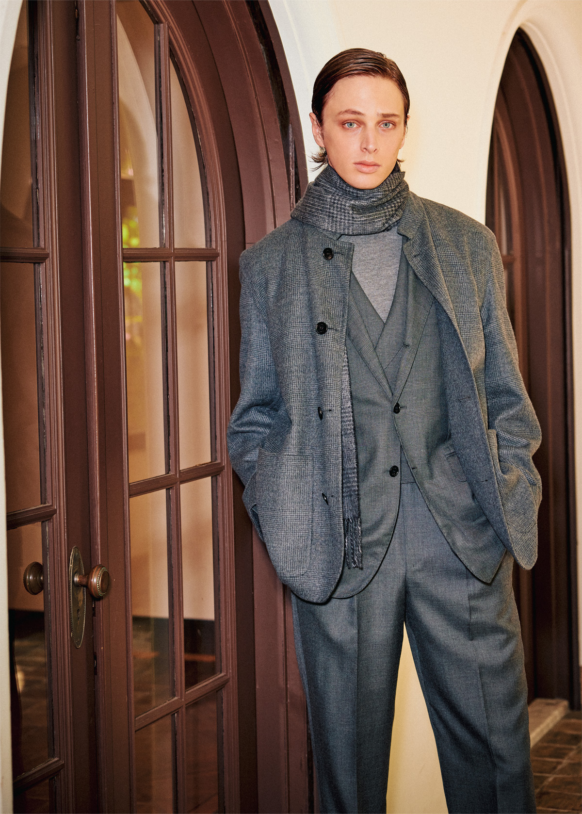 サイモンが提示するタイムレスラグジュアリー大柄グレンチェックによるダブルフェイスのウールドライビングジャケットに、ハウンドトゥースのウエストコート、カシミアのタートルネックニット&トラウザーズが響き合う。柄のリズムが奥行きを生み、上質なグレーのトーンが洗練を湛える。装いの表層にヘリテージのエレガンス、内側にはマテリアルの贅沢を纏ったその調和こそが、サイモンが目指すタイムレスラグジュアリーの産物だ。ドライビングジャケット¥587,400、ジャケット¥704,000、ウエストコート 参考商品、ニット¥167,200(参考色)、トラウザーズ¥250,800、マフラー 参考商品 all by dunhill(ダンヒル TEL.0800-000-0835)