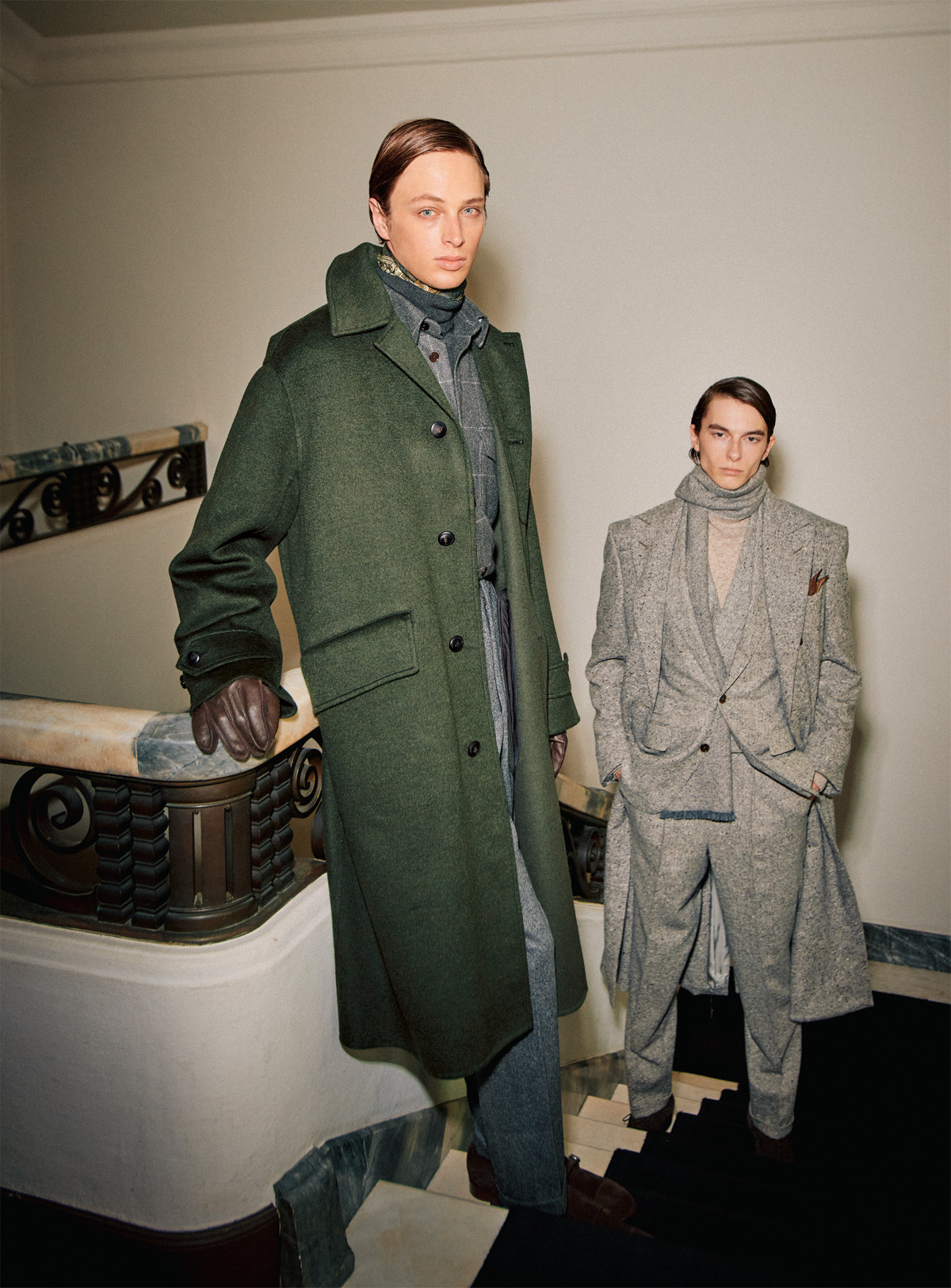 新しい息吹を纏うドニゴールツイード(右)カシミアのドニゴールツイードで仕立てられたトップコートが生み出す格調高いドレープ。さらに、ソフトなウールのジャケット、ウエストコート、そしてトラウザーズも同じドニゴールのツイードで重ねている。この素材が本来もつ強さに柔らかなエレガンスを添えることで、現代の感覚で見事に再構築された装いだ。伝統の素材に新たな命を吹き込むことで、クラシックは新しい体験へと変わるのだ。コート¥1,039,500、ジャケット¥435,600、ウエストコート¥171,600、ニット¥176,000、トラウザーズ¥148,500、マフラー ¥88,000、ポケットスクエア ¥33,000、シューズ 参考商品 all by dunhill(ダンヒル TEL.0800-000-0835)