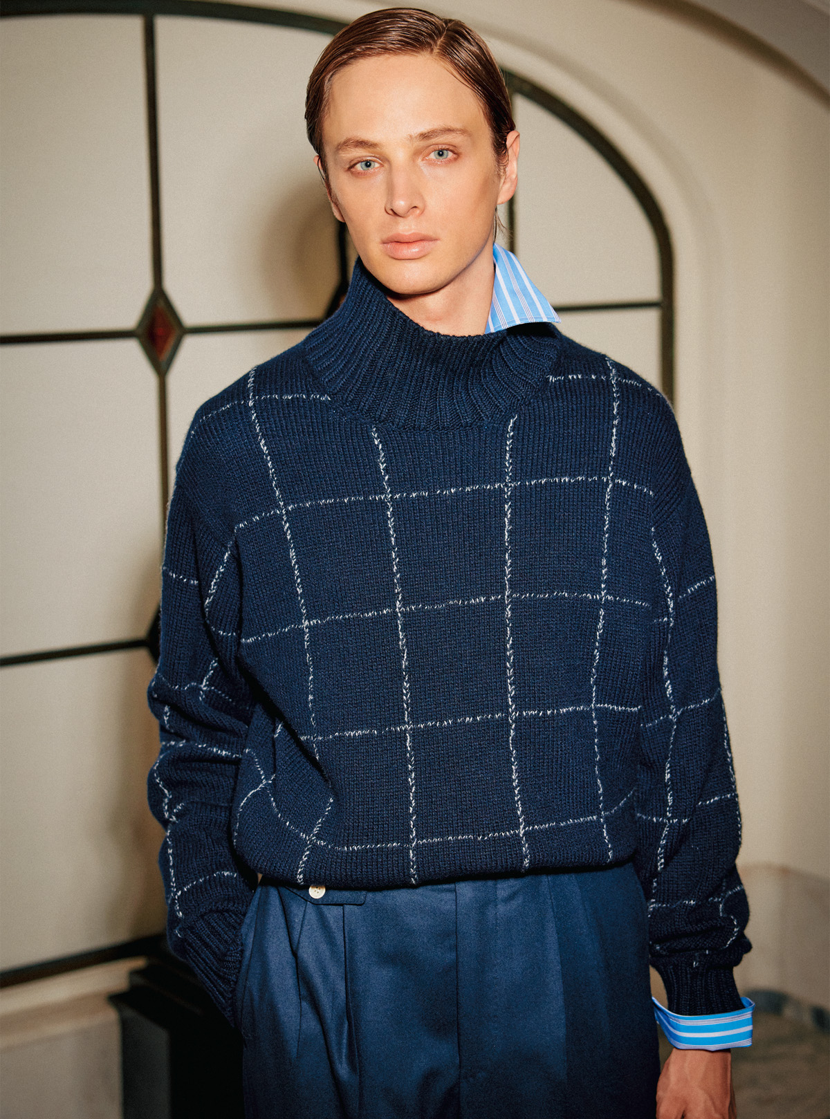 控えめな佇まいの中に宿る英国紳士の美意識大胆な格子柄のカシミアニットに英国らしい柄行のストライプシャツを重ね、カシミアのグルカトラウザーズ。上質な素材が生む表情と、異なる柄の組み合わせによるアクセントが見事な調和を生み出している。質感は至極ラグジュアリーでありながら、装いの佇まいは控えめ。ここにもサイモン・ホロウェイの美意識が見てとれる。素材とプロポーションで現代性を示した、これぞ新たなクラシック。ニット¥393,800、シャツ、グルカトラウザーズ ともに参考商品 all by dunhill(ダンヒル TEL.0800-000-0835)