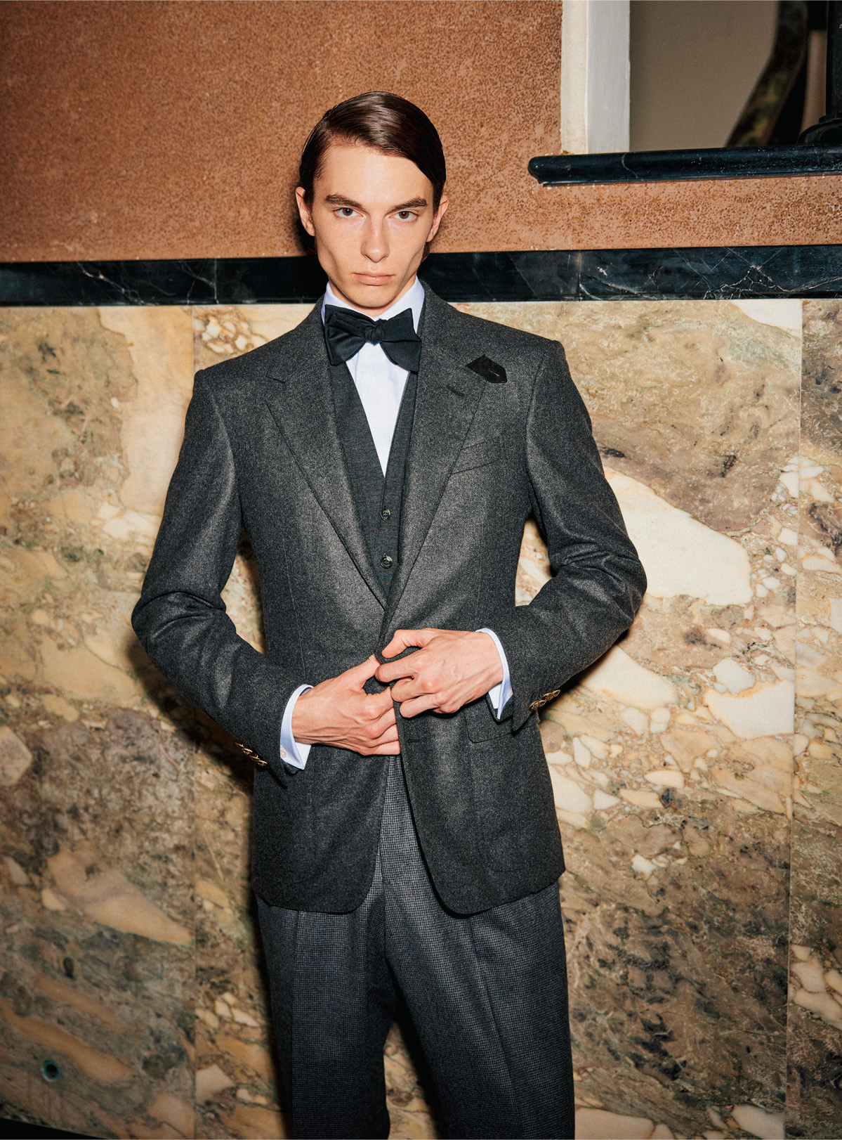 グレーで再解釈したフォーマルのムードスロートタブ付きのカシミアブレザーにウールのニットベスト、コットンツイルのシャツを合わせ、ハウンドトゥースのハイバックウールトラウザーズという、グレーベースのモノトーンレイヤード。タキシードを想起させるフォーマルなムードを日常服の要素、グレーで再解釈した装いだ。伝統的なイブニングスーツの記号を借りながらも、素材やディテールはあくまで英国クラシックの延長線上に置かれ、現代的な自由さを湛えている。ブレザー ¥603,900、ニット ¥210,100、シャツ¥94,600、タイ 参考商品、トラウザーズ¥180,400 all by dunhill(ダンヒル TEL.0800-000-0835)