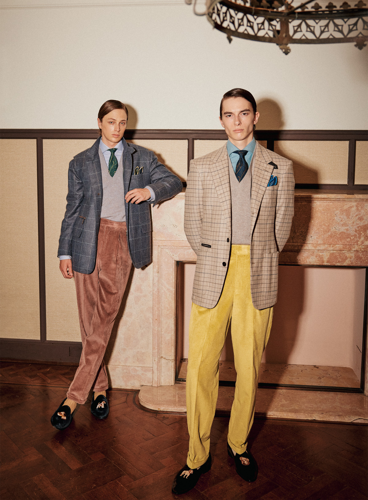 新たな洗練を纏ったハッキングジャケット(左)グレーのウインドウ・ペーンが走るウールカシミアのハッキングジャケットに、深いVネックのカシミアニット。くすんだ絶妙な色合いのコットンカシミアのコーデュロイトラウザーズを合わせ、英国のカントリースタイルを柔らかなマテリアルで都会的に再構築している。サイモン・ホロウェイのコレクションは、英国のファブリックと職人への敬意に満ちていると、再確認させられる装いだ。揺るぎない愛に満ちている。ジャケット¥805,200、ニット¥231,000、シャツ¥78,100、タイ¥40,700、トラウザーズ¥159,500、ポケットスクエア¥37,400、スリッパ¥250,800 all by dunhill(ダンヒル TEL.0800-000-0835)