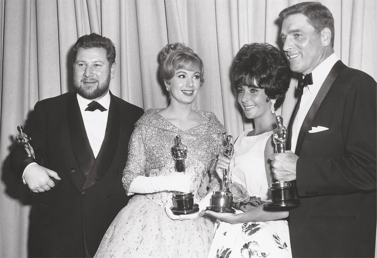 1960年度アカデミー賞受賞者。左からピーター・ユスティノフ(助演男優賞)、シャーリー・ジョーンズ(助演女優賞)、エリザベス・テイラー(主演女優賞)、バート・ランカスター(主演男優賞)。
