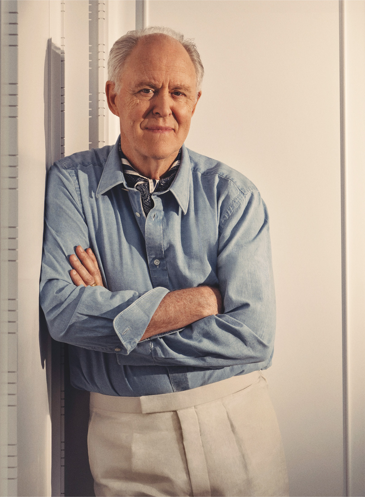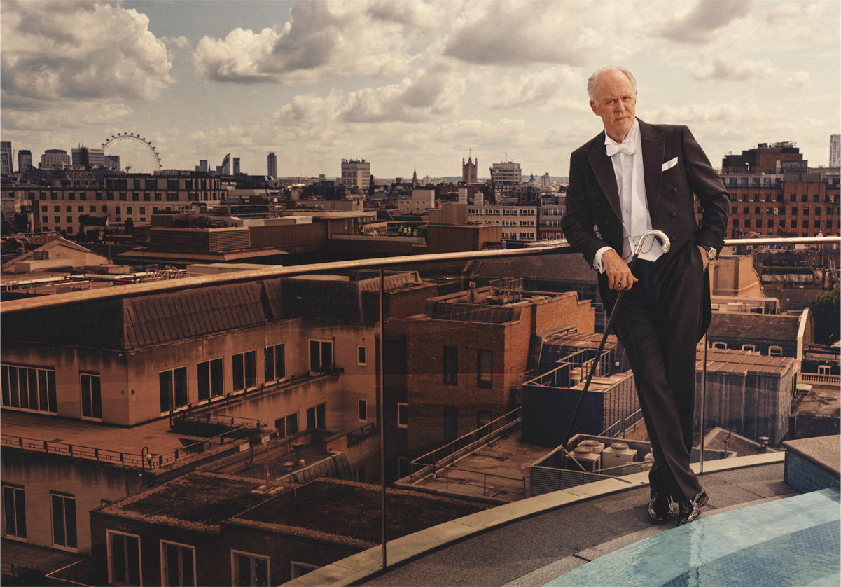 俳優のインタビュー記事を書く仕事は、ときに厄介である。例えばこんなことがある。相手が好感度のかなり低い人物だと、会ってからわかる。言葉を勝手に切り取られて書かれるのを恐れるあまり、心にがっちりと鍵をかけている。あとは、キャリアがあまりに膨大で実績が山ほどあるために、記事で網羅するのが無理なケース。ジョン・リスゴーはまさにこの部類である。彼の活躍ぶりを目にしたいなら、彼が主演の舞台『Giant(原題)』へ足を運んでほしい。主格決定論(名前がその人の仕事や運命に影響を与えるという考え)の典型例というべきか、リスゴーは巨人である。実際、彼は背丈もある(193センチ)のだが、同時に風格も持っている。その圧巻の風格をゆったりと纏い、今回の撮影に臨んだ。