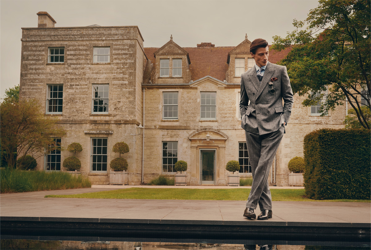 グレーフランネルは不変のスタイル元英国首相ウィンストン・チャーチルや、小誌の名の由来である稀代の洒落者、ジャンニ・アニェッリもグレーフランネルのスーツを愛した。このルックのスーツは英国サヴィル・ロウに1849年から店を構えるハンツマンの仕立て。シャツは老舗バドのもの。足元にはマノロ ブラニクのセミブローグをコーディネイト。