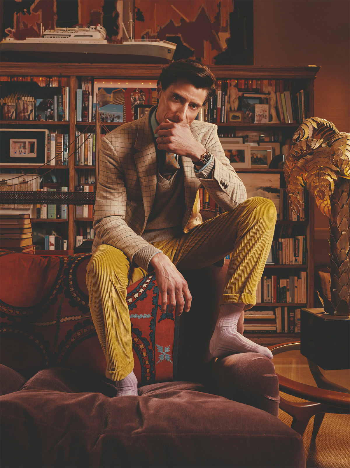 英国的カントリースタイルの手本タッターソールチェックのスポーツジャケットに同系色のベスト、ライトブルーのシャツ、からし色のコーデュロイのトラウザーズを合わせて、クラシックな英国的カントリージェントルマンを表現。手元にはパテック フィリップのコンプリケーション、「アニュアルカレンダー」を身に着けて。