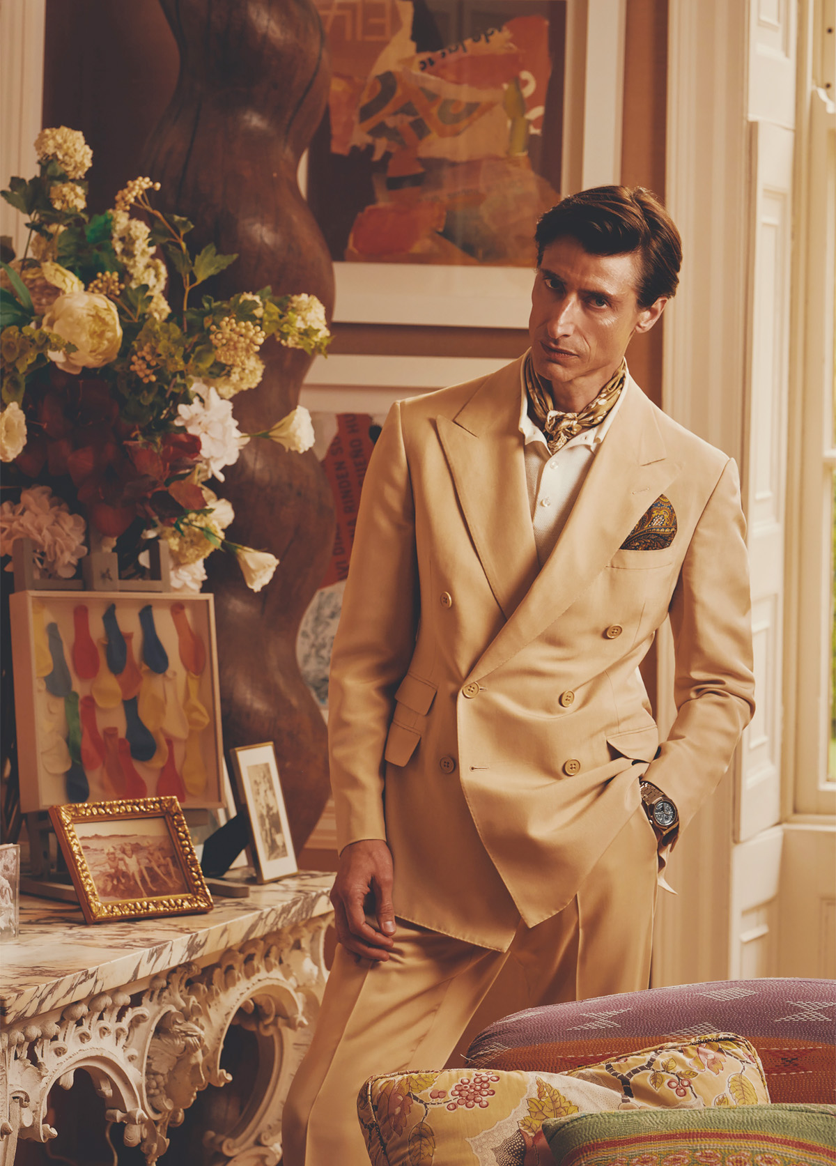 サンドベージュで上品に柔らかに英国的ディテールが特徴的なスーツはラルフ ローレン パープル レーベルの仕立て。清涼感のある白と柔らかなサンドベージュは好相性。ネッカチーフとポケットチーフ、時計のブレスレットの色味をリンクさせスタイリングに刺激を。時計は複雑機構を搭載する、オーデマ ピゲの「ロイヤルオーク パーペチュアルカレンダー」。