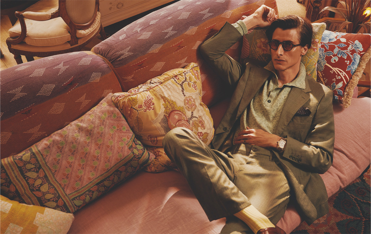 自然に着想を得てグリーンのスーツに杢調のポロシャツを合わせたスタイリング。ポロシャツの襟を立てて、こなれ感を演出。ブラウンのシューズ、チーフ、サングラスのレンズと、全体をブラウンとグリーンのアーストーンでまとめた。