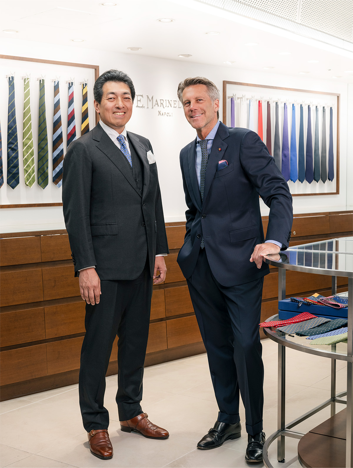 「エレガンス?装いなら、何といってもブルー、ブルー、ブルー。そしてシンプルであること。サヴォイア家にはシンプルさがエレガンスの重要な要素との考えがあります。これは、イタリアでも最高峰の仕立てを習得した佐藤さんが、日本人の緻密さと誠実さで作った最高のスーツ。着られることは無上の喜びです。サヴォイア家にはブルー・サヴォイアという固有の色があります。さっき佐藤さんの店で、それを彷彿とさせるシルクカシミアのイタリア生地を見つけました。次はこれですね。特に値の張る生地とのこと、後で相談しましょう(笑)。裏地はもちろんブルー・サヴォイアで。他にも、ノード・サヴォイアという結び方など、家に伝わるさまざまな伝統があります。こういう伝統継承を含め、日伊は文化や考え方が似ていますね。父の服は、長くミラノのペコラ親方が作っていましたが、一番弟子の佐藤さんは、それを手伝っていたと聞きました。世界の狭さにはびっくりです」