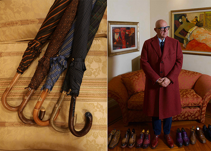 シャツはナポリのメローラ・エ・デレーロほかローマのバッティストーニ。靴はマダム・オルガと親交が深いことからベルルッティを愛用し、50足以上を所有。傘はもちろん、ナポリが誇るマリオ・タラリコだ。「カプリに雨は似合わない」と笑いつつも、マッサッチェーシ氏のスペシャルモデルを含めてこれまでに50本以上をオーダーしている。