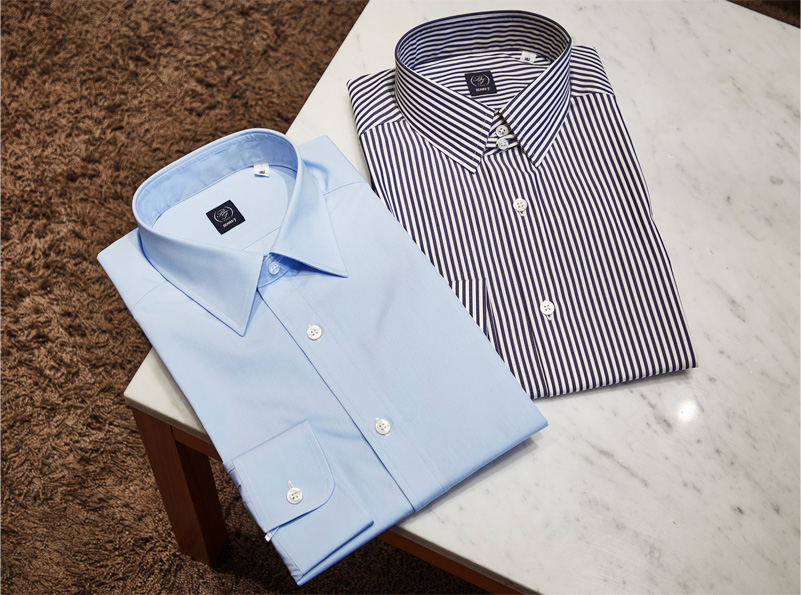 バイヤー就任後に展開するこちらのシャツは、クラシックなフランスのドレスシャツがもつムードを取り入れながら、日本製にすることで、縫製や着心地をアップデートさせている。ワントーン濃いフレンチブルーが間瀬氏らしい提案だ。左¥30,800、右¥29,700 both by Beams F(ビームスF Tel.03-3470-3946)