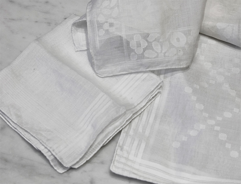 シンプルな装いを好むからこそ、白のポケットチーフには徹底したこだわりをもつ。左はシモノ ゴダール、中央と右はパリの蚤の市で見つけたヴィンテージだ。