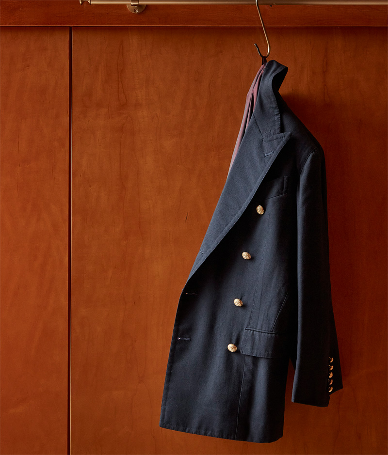 8ボタンのブレザーは、かつてビームスに勤務していたビスポークテーラー、サルトリア ヤマッチに仕立てもらったもの。往年の英国のクラシックで構築的なスタイルに、ナポリらしいディテールを取り入れた、伊藤氏ならではのこだわりが詰まった一着だ。