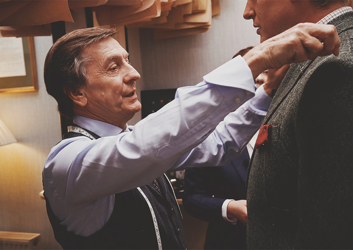 この物語を決定づけるもうひとりが、元ハンツマンのカッター、ダリオ・カルネラだ。私は彼に2着仕立ててもらったことがある。仕上がりのよさは当然として、印象的なのは仕事の運びそのものだ。工程が完成に向かって無駄なく積み上がり、判断に迷いがない。控えめでありながら服には揺るぎない自信が漲っている。サヴィル・ロウの頂点級の実力者であることは、服より先にプロセスが証明してしまう。だから、テリーとダリオが手を組んだと知ったとき、素直に嬉しかった。テリーはハンツマンでキャリアを築き、ダリオはその中心地を離れて別の舞台に立った。方向性は違っても、どちらも一級で、到達点は同じである。私がその連携を実感したのは、ふたりと仕事を始めてから1年ほど経った頃だった。