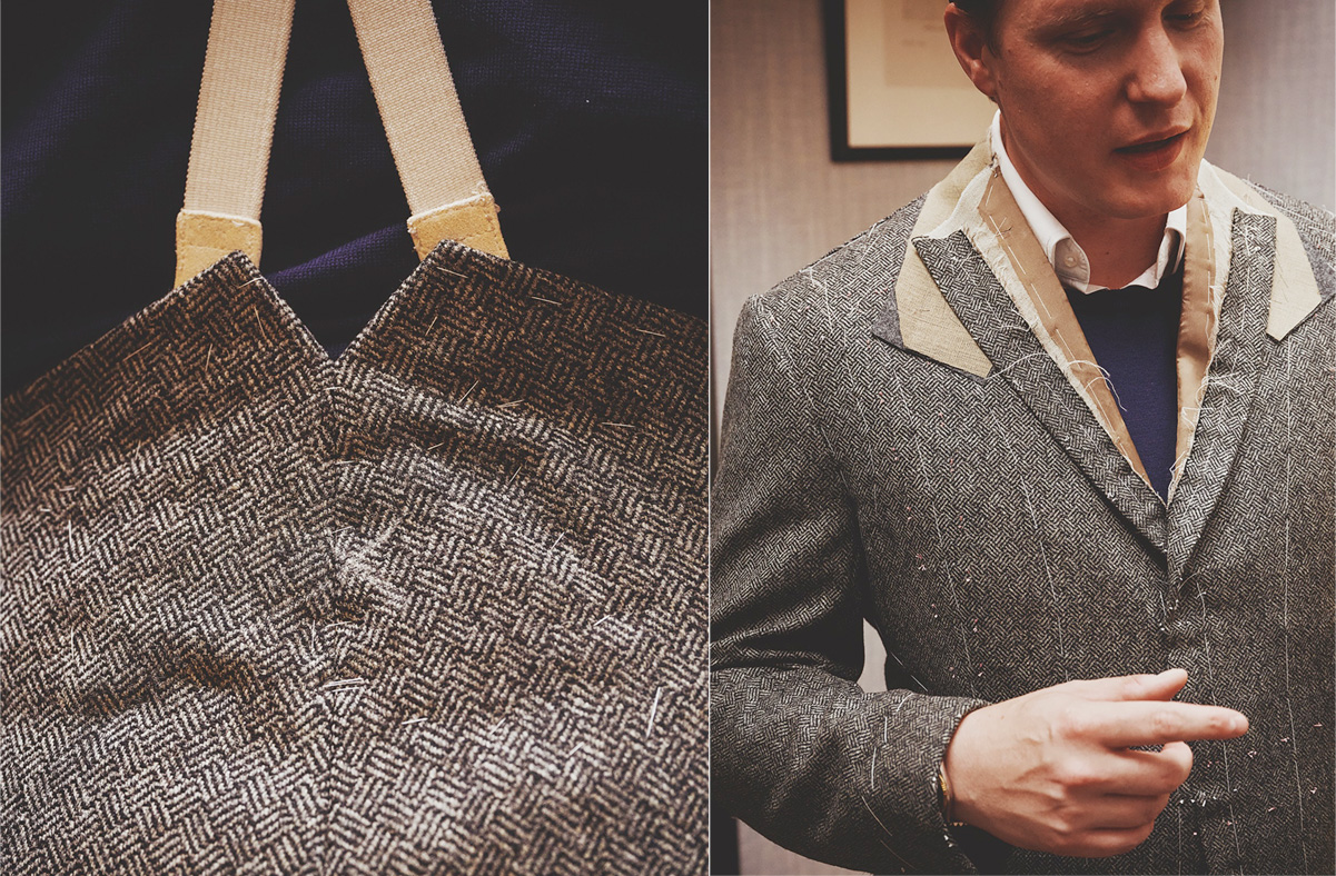 ファーストフィッティング。仮縫いの3ピースがまず輪郭を見せ、続く2ピースも同じチャコールツイードで成立するかを同時に検証する。セーターを着たまま、肩、胸、首元、股上、ブレイシーズの引きを確認。動きとシルエットの両立を図り、若いカッターが脇で学びつつ、テリーとダリオが要所を整えていく。