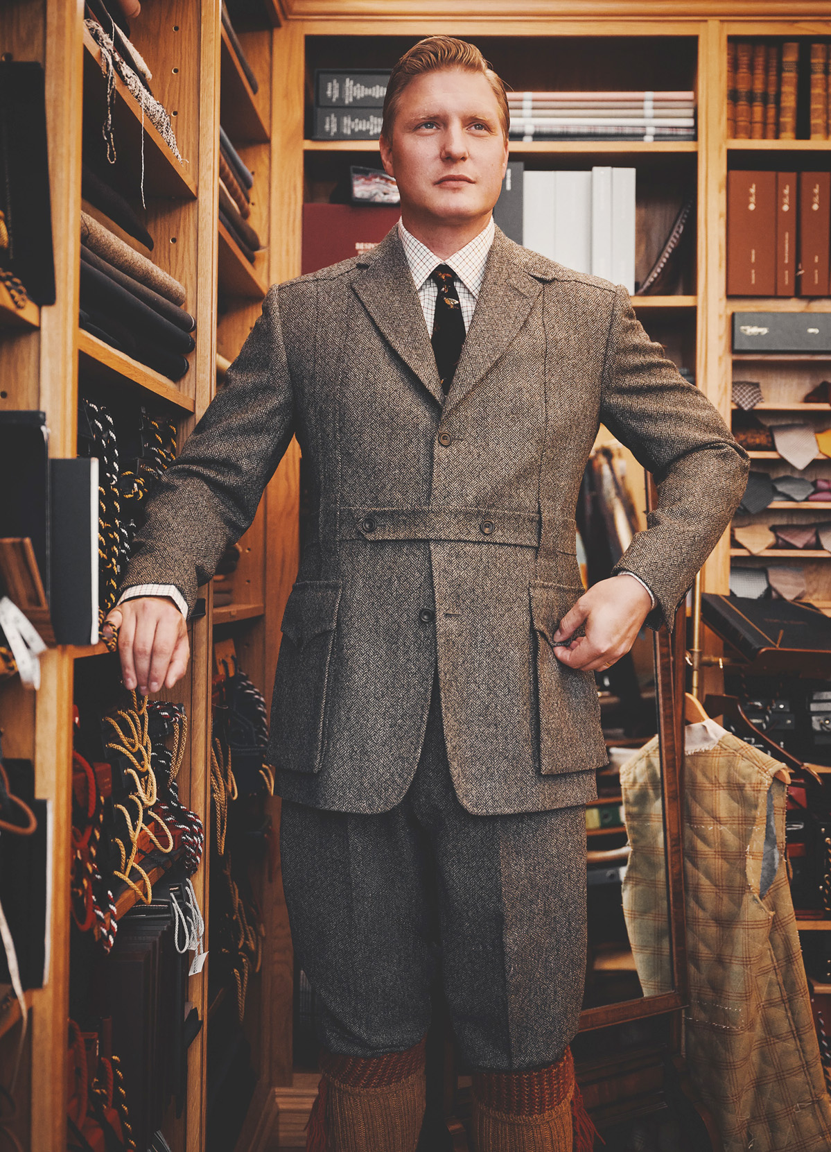 そして今回、その連携を最も分かりやすい形で見せたのが「5ピース」の注文である。正直に言えば少し大げさかもしれない。シューティング(狩猟)の装いは通常、ジャケットとベスト、あるいはブレックスまで揃えれば十分に成立する。だが私は、週末のシューティングに必要な装いを一気に完成させたかった。関わるのはテリーとダリオだけではない。テリーが育て、いま伸び盛りの若いカッターふたり、スヤンバ・クマラセンとモリー・フレスク=マクラーレンも加える。手の痕跡がそのまま残る形で、チームの仕事をひとつの体系として見せたかった。結果として、撮影の狙いはきれいに着地した。
