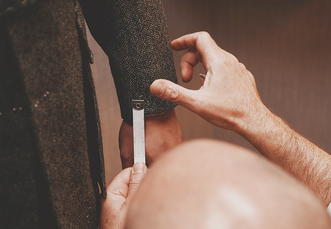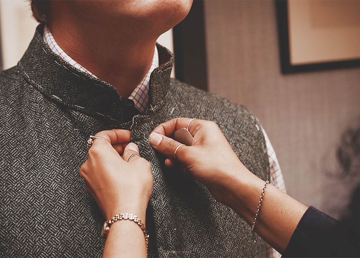 セカンドフィッティング。首元を詰め、袖丈を測り、裾の癖を拾う。要所の数ミリを正されて輪郭を得る。ノーフォークのベルトやベストのバランスもここで決まる。静かな興奮のなか、シューティングの3ピース(ノーフォークジャケット+シューティングベスト+ブレックス)、街でも着られる2ピース(通常のジャケット+通常のトラウザーズ)の5ピースが、いよいよ「装い」になる。