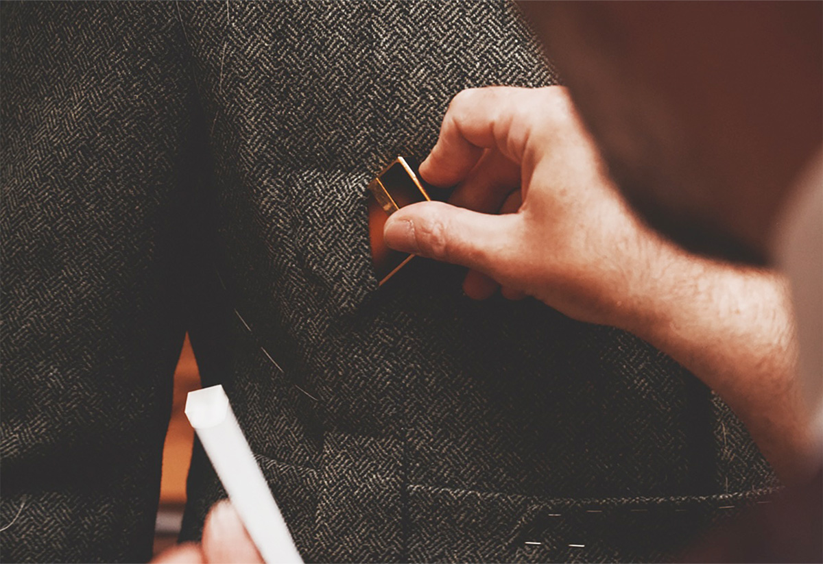 生地選びが全体を左右する。テリーは数年前から自分たちのハウスツイードを展開し、現在は5つの柄を揃えている。ラヴァット・ミルの生地で、3つはロッホのバスケットウィーブ。色はブルー、タバコ、そしてチャコールである。私たちが選んだのはチャコールだった。荒い石や苔の色が混じるスコットランドの景色を思わせる、いわゆるエステートツイードの気配があり、同時に黒白のグレンチェックも連想させる。何より、この色はカントリーだけでなく街にも繋がる。