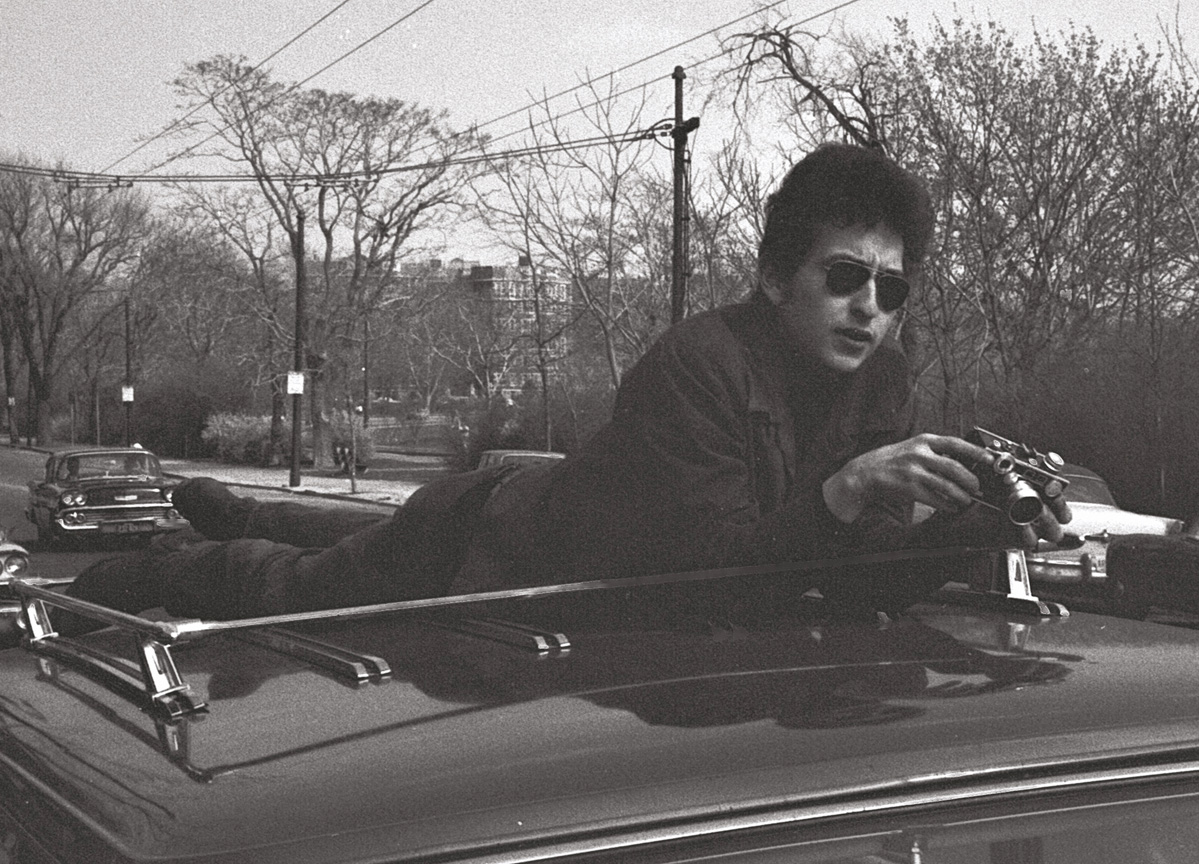 アメリカ、マサチューセッツ州でクルマの上でカメラを構えるディラン(1964年)。