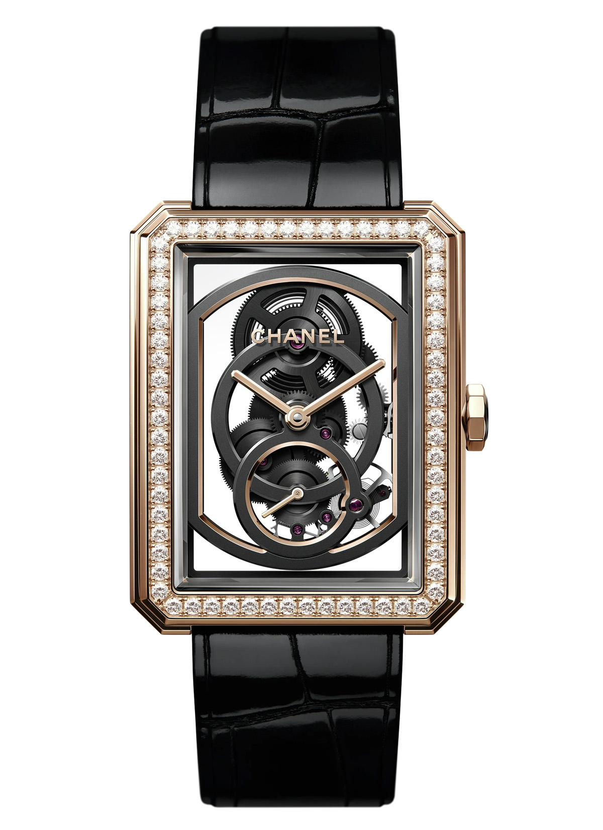 幾何学的な構造美のモダンスケルトン上下をアーチ状としたフレーム内に円が重なるスケルトンは、いかにもモダン。美しく連なる円で構成された自社ムーブメントの仕上がりの見応えは十分である。黒いムーブメントとのコントラストでベージュゴールドの淡い色味とダイヤモンドの輝きが一層映える。艶やかなストラップも、ドレス感を高めている。手巻き、18Kベージュゴールド×ダイヤモンドケース、37×28.6mm。¥9,691,000 Chanel
