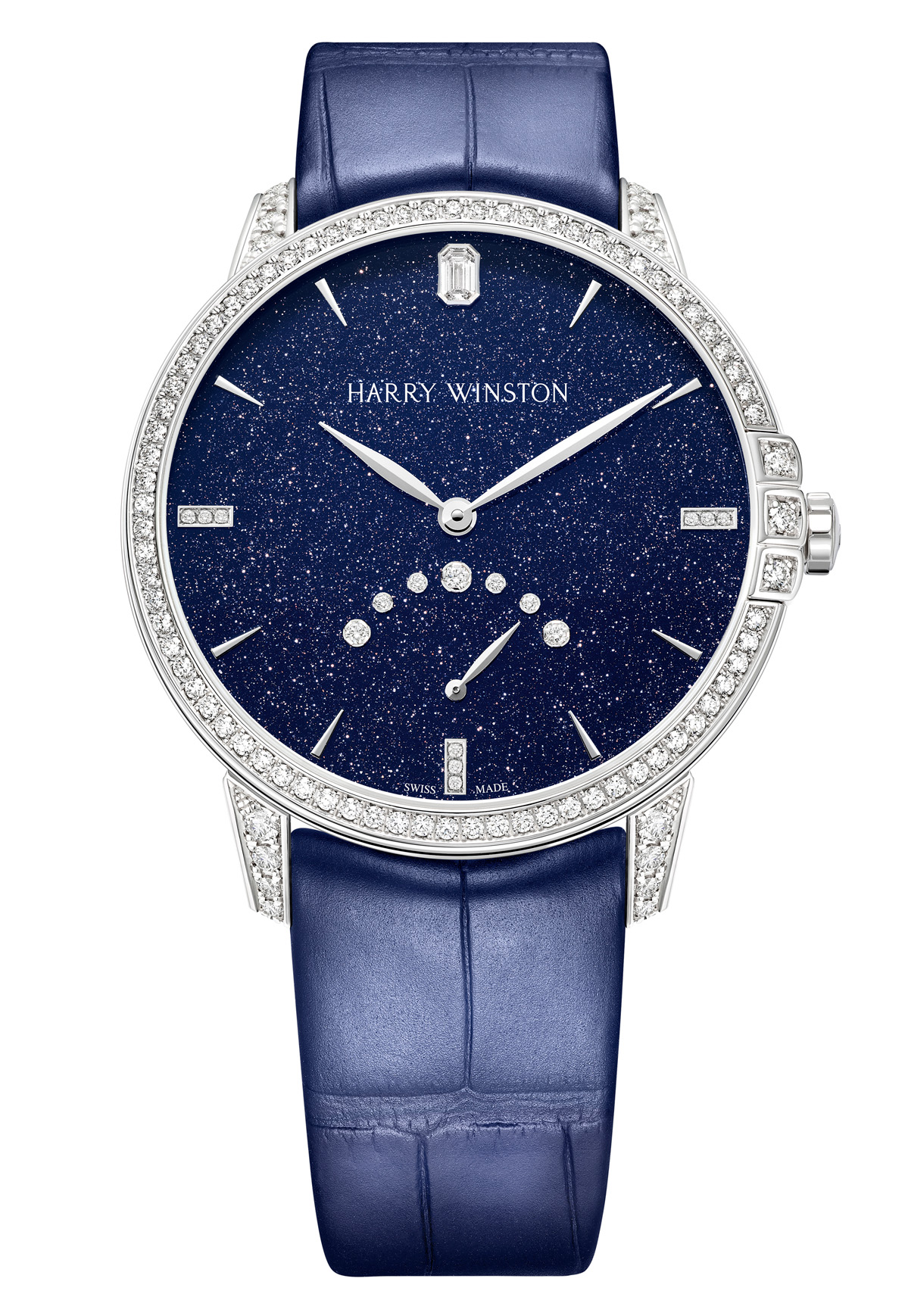ダイヤを指し示す30秒レトログラードタイムレスなHW ミッドナイト・コレクションからの1本。アベンチュリン製ダイヤルの上でダイヤモンドが煌めく様子は、星空のよう。ダイヤルの色合いは深くシックで、宝石の輝きが一層美しい。30秒レトログラードの針が指すダイヤのインデックスは、ティアラのシルエットを想起させる。自動巻き、18KWG×ダイヤモンドケース、39mm。¥5,016,000 Harry Winston