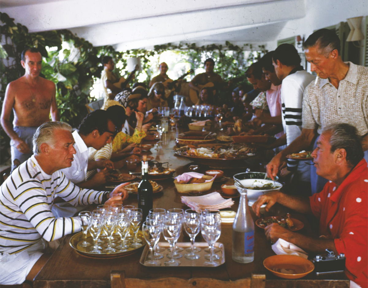 アカプルコでの長い昼食会に招かれたゲストたち(左から右へ)は、俳優ダグラス・フェアバンクス・ジュニア、デザイナーのオスカー・デ・ラ・レンタ、その背後に立つエミリオ・プッチ。