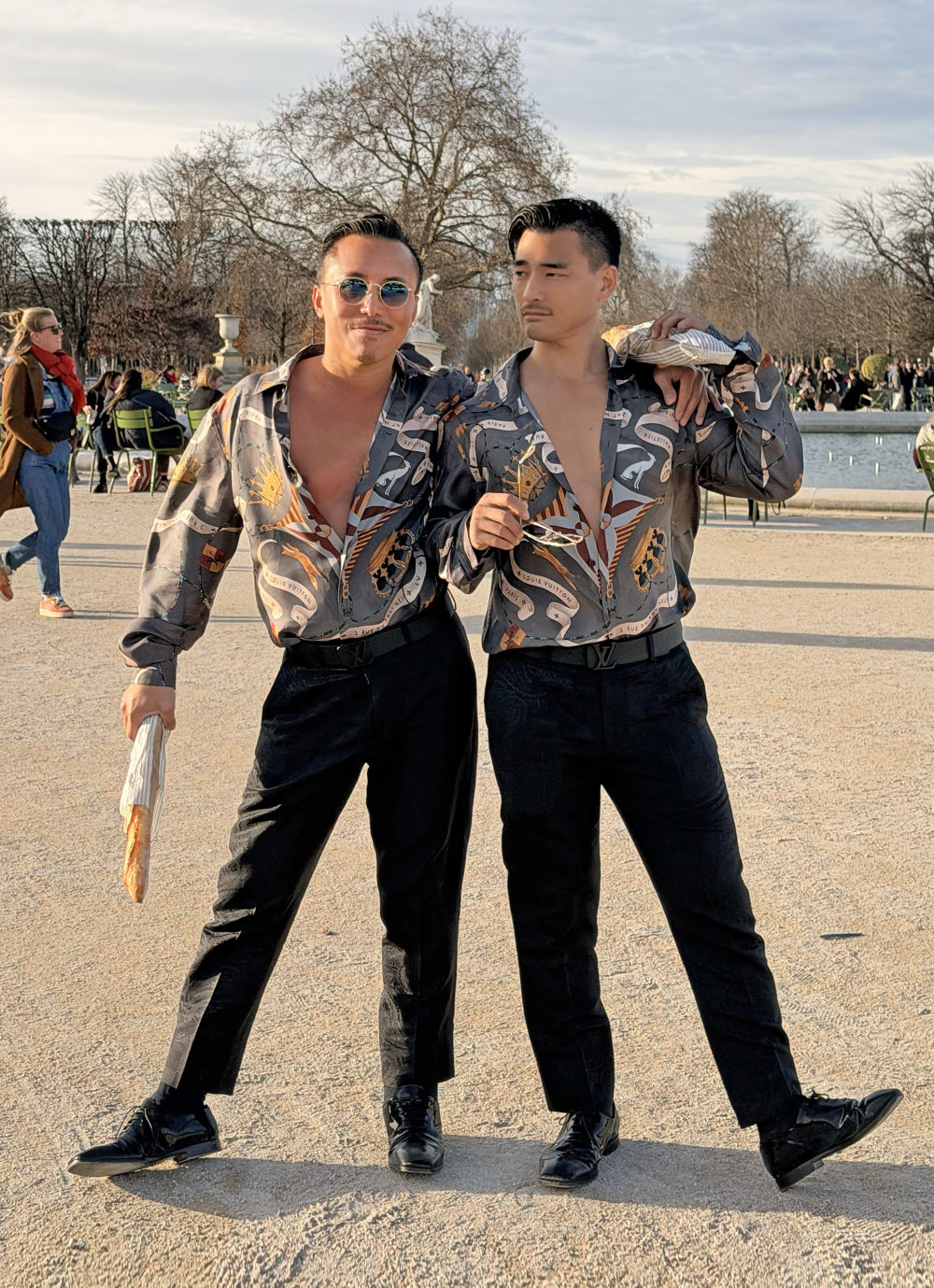 コンコルド広場とルーヴル美術館のあいだに広がるチュイルリー公園で、バゲットを手に。「ここは私にとってとても特別な場所なんです」とレスリーは語る。2000年に初めてパリを訪れて以来、必ず立ち寄る場所なのだそう。6月、陽射しが美しく心地よい季節には、ファッション業界の友人たちと集まり、午後のピクニックを楽しむこともあります。冬には観覧車が立ち、季節ごとに表情を変えるこの庭園は、彼がいちばん自然体でいられる場所でもあるのだそう。この日二人が纏ったのは、ルイ・ヴィトンのシルクシャツ。交際中に銀座・松屋で初めて目にし、直感的に惹かれ、その後、札幌のルイ・ヴィトンで購入を決めた一着。ブラックのパンツ、ベルト、シューズもすべてルイ・ヴィトン。滑らかなシルクシャツの軽やかさに、黒のシャープさが加わり、セクシーでありながらエレガントなバランスを生み出しています。のちに二人は、この装いでシンガポールの結婚式にも出席しました。将真はクルーのサングラスを、レスリーはレイバンを合わせて。肩の力の抜けた自然さと、深く個人的な記憶が重なるひとときです。