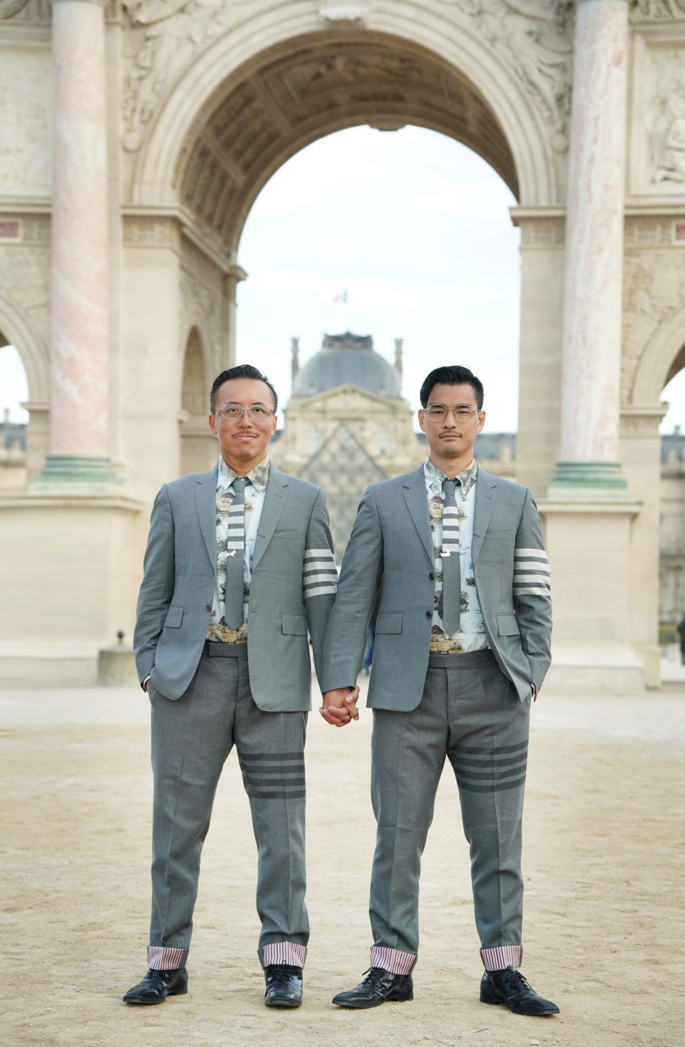 カルーゼル凱旋門(Arc de Triomphe du Carrousel)の前で。ナポレオン様式のアーチの下に並び立つ二人が纏うのは、トム・ブラウンの代表作である“4バースーツ。ジャケット、シャツ、トラウザーズ、そしてタイまですべてトム・ブラウンで揃えたこのルックは、彼らにとって特別な意味を持ち、最も愛用しているスーツのひとつでもあります。腕とパンツに走る象徴的な4本ラインは、ペアルックでありながら、それぞれの個性を際立たせています。足元にはルイ・ヴィトンのシューズを合わせ、構築的なシルエットにさりげないラグジュアリーを添えています。眼鏡はプラダ。クラシックなフレームが、トム・ブラウンの知的でどこかアイロニカルな美学と美しく呼応しています。歴史的建築の壮麗さを背に、手を取り合うレスリーと将真。その姿は、心と思考を分かち合いながら一つの心として歩む関係性を象徴しているかのよう。社会の中で誇り高く立つ“知性あるカップル”としての静かな佇まい——それは二つの感性が重なり合う、控えめでありながら確かな宣言の瞬間でもあります。