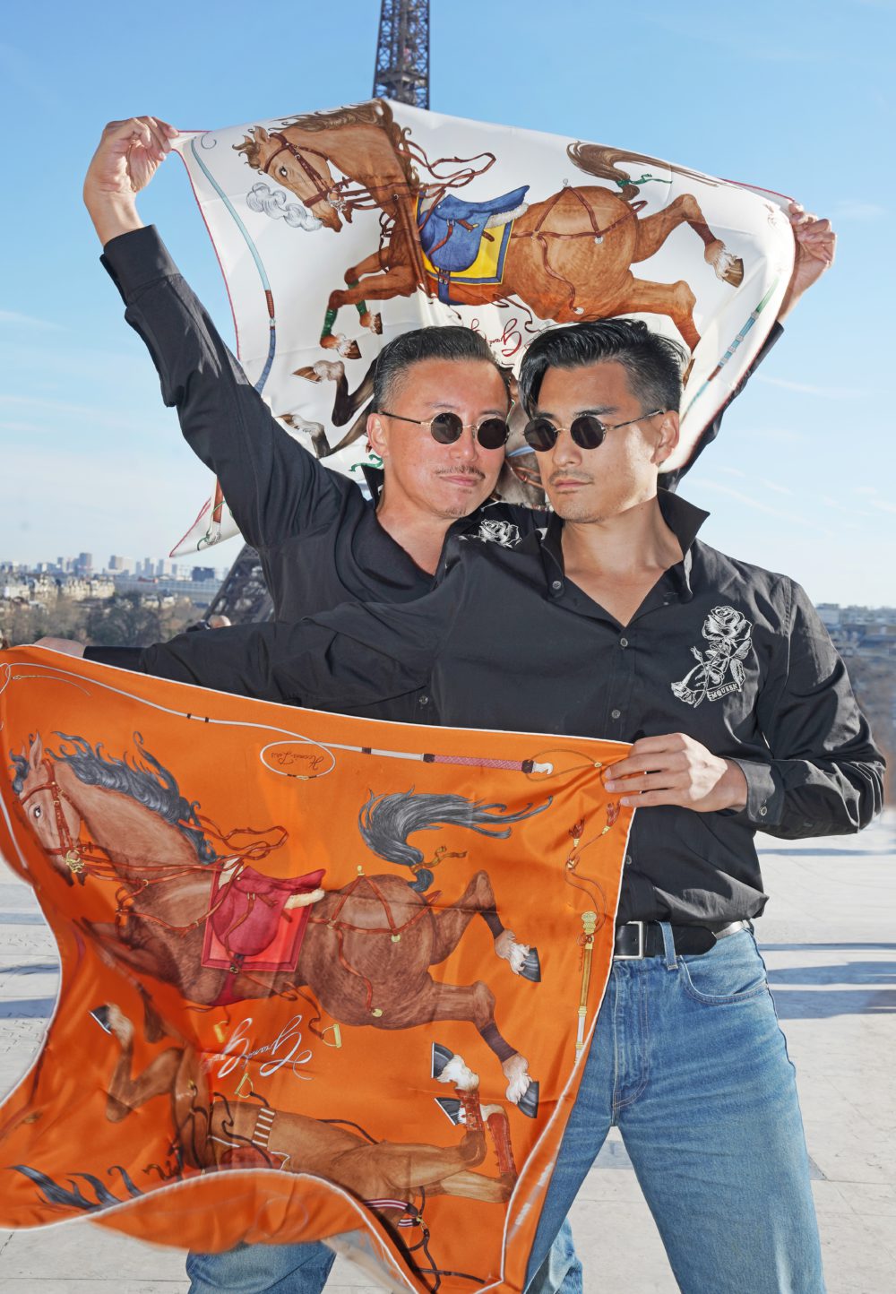 トロカデロ広場、エッフェル塔を背に。この日はとにかく風が強かった。強風に翻るシルクスカーフはエルメス。メンズアパレルは決して手の届きやすい価格ではないですが、それでも抗いがたい魅力を放つ存在。二人にとって初めての新年の贈り物として、ハワイで購入した一枚。干支でもある馬のモチーフに強く惹かれ、互いにとって最初のエルメスコレクションとなりました。馬は二人に共通する好きな動物でもあり、この写真をより意味深く、思い出深いものにしています。シャツはアレキサンダー・マックイーン、サングラスはディグナ クラシック、デニムはリーバイス。ラグジュアリーと日常の軽やかさが自然に溶け合い、全体に柔らかな抜け感をもたらしています。撮影は友人のタクミ・サンキョウ。強い風さえも味方につけた、その瞬間が静かに記憶へと刻まれています。