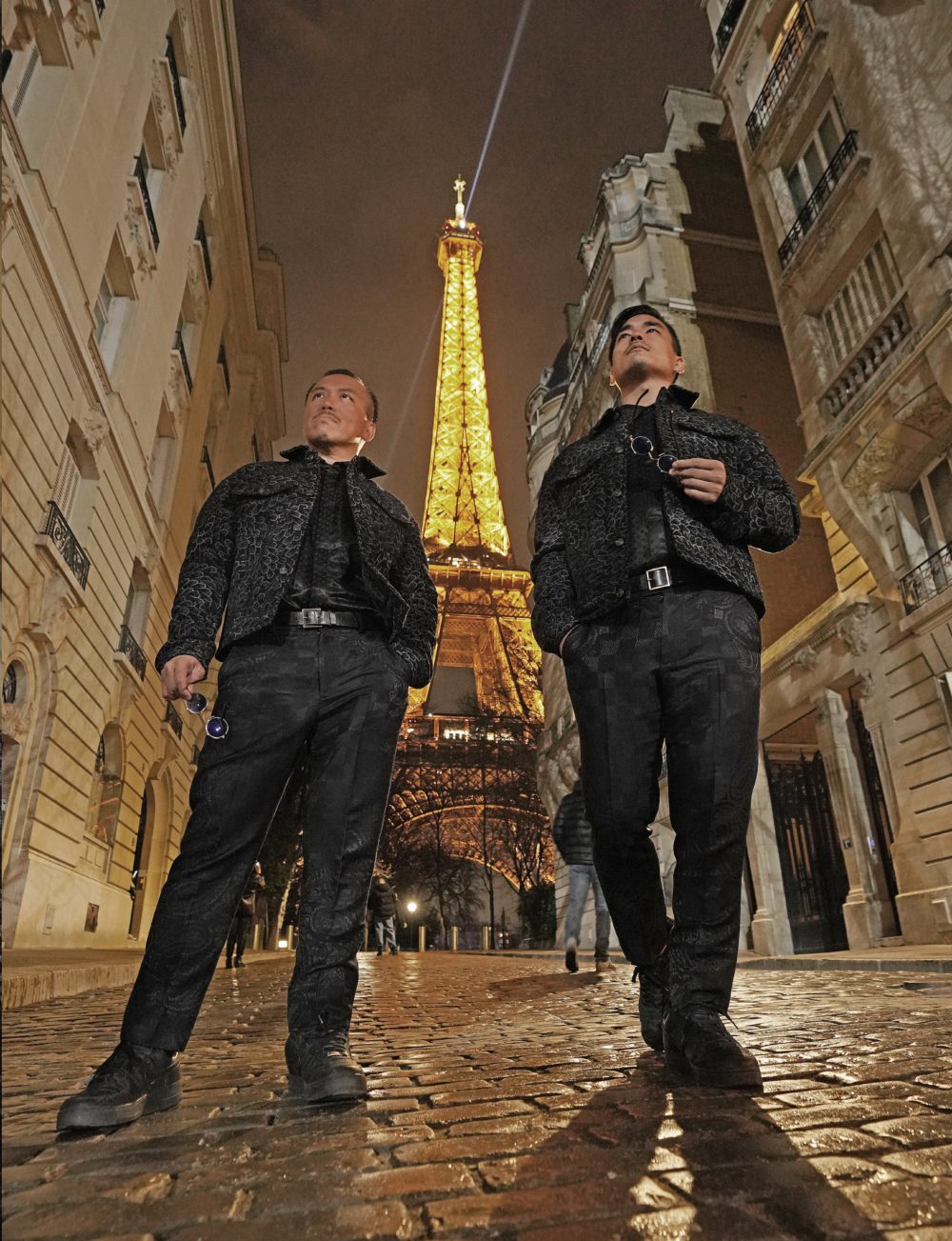 夜の石畳に残る湿り気が、静かで紛れもなくパリらしい空気を際立たせる。この日のスタイリングの鍵はレイヤード。アウターはキース、シャツとパンツはルイ・ヴィトンで統一し、足元はナイキで引き締めています。ピーコックを思わせるプリントが施された希少なショート丈のジャケットは、ハワイで将真が一目惚れした一着。「これでいい」ではなく、「これがいい」と迷いなく選んだそう。キースは、二人にとって初めて購入したストリートブランドでもあります。複数のブランドを重ねても過剰にならないのは、色と素材のバランスが整っているから。エッフェル塔を背にしても、服は夜の風景に埋もれることなく、確かな存在感を放っています。