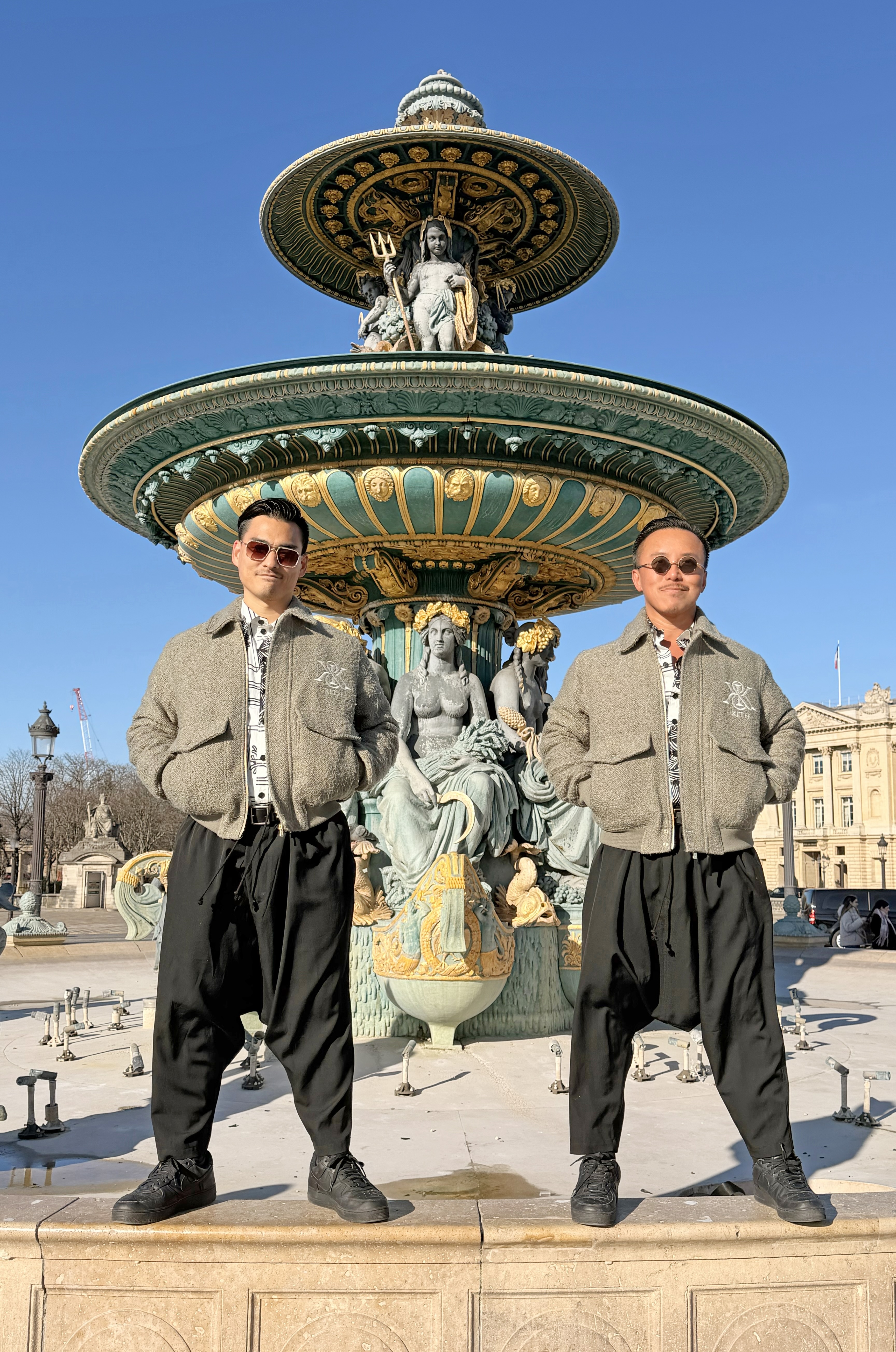 パリ・ファッションウィーク期間中に撮影された一枚。舞台は、コンコルド広場にある象徴的な噴水《フォンテーヌ・デ・メール》。この日のテーマは“ボリュームのコントロール”。ジャケットはキース、インナーにはクリストファー・ネメスのシャツを重ねています。袖や背中にゆとりを持たせたリラックスしたトップスが、あえて余白を生み出します。対照的に、ボトムスはヨウジヤマモト。サムライパンツを思わせる鋭いラインが、全体のシルエットを引き締めています。足元はナイキで軽さを加え、将真はクルー、レスリーはディグナ クラシックのサングラスを合わせています。「上はフラットに、下はキュッと締める」と二人は同時に語ります。まさに“Great minds think alike”。誇らしげに並び立つその姿は、まるで帝国を守る戦士のようでもありました。緩める場所と締める場所を明確に分けることで、重さを感じさせない緊張感が生まれます。ボリュームは削るものではなく、操るものなのです。