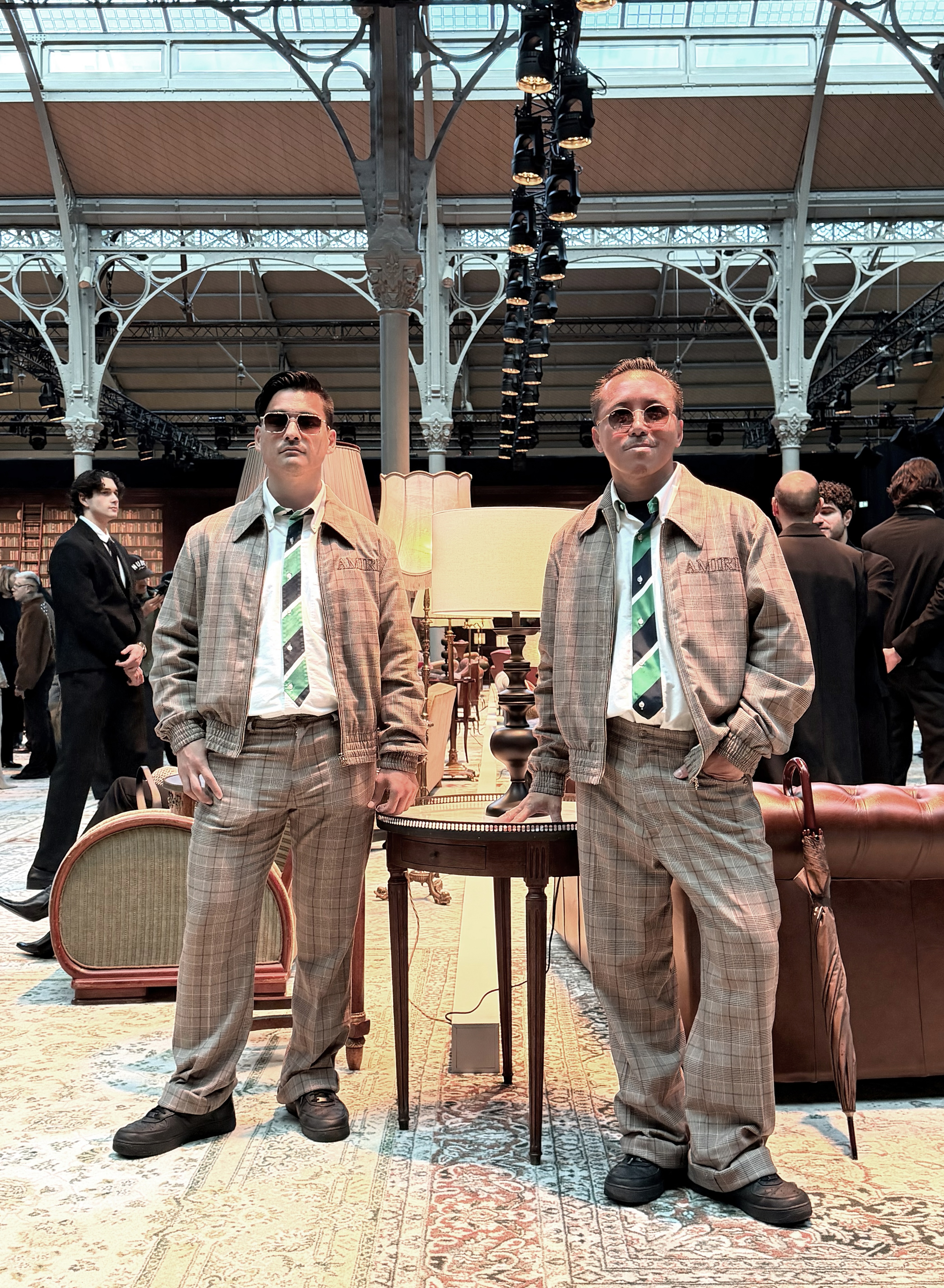 「実はこれ、タイじゃなくてプリントなんです」とレスリーは微笑みながら教えてくれました。一見、きちんと結ばれたネクタイのように見えるが、実際は白いシャツに直接施されたトロンプルイユ。トム・ブラウンならではの遊び心あふれるイリュージョンピースのひとつです。 この日の主役は、ロサンゼルス発のブランド、アミリ。2026年秋冬ショーの招待状が届いたのは、パリ・ファッションウィークの最中、前日の夜でした。しかし二人の手元にはアミリのアイテムがなかったのです。「カップルとして招待されたのなら、デザイナーへの敬意として、やはりアミリのペアルックで出席したい」——そうレスリーは決断し、急いで探しに向かいます。奇跡的に、プランタンで見つかったのは似たテイストの二着のみ。しかもサイズも雰囲気も驚くほどぴたりと合いました。柔らかな生地感、ゆとりのあるプロポーション、控えめなチェック柄。足元はナイキでバランスを取り、将真はクルー、レスリーはレイバンのサングラスを合わせました。計画された装いではありませんでした。しかしタイミングと直感、そして偶然が重なり、その日のアミリは忘れがたい瞬間の記録となったのです。カップルとして大切な決断を共にし、目標と満足を分かち合った一日でもありました。