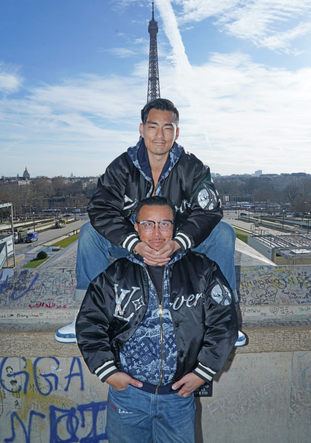 トロカデロ広場、エッフェル塔を正面に望む場所で。「これは冬にいちばんよく着ている、僕たちにとって一番心地いいペアルックなんです」と、レスリーと将真は笑顔で声を揃えます。ファレル・ウィリアムズがクリエイティブ・ディレクターに就任して以降のルイ・ヴィトンのコレクションで、2024年12月にパリでレスリーが購入した一着は、自然と定番になりました。付き合い始めた頃、将真はほとんど毎日のように袖を通していたそうです。やがてそのジャケットは店頭から姿を消してしまいました。それでも「どうしても同じものを二人で着たい」と探し続け、約5か月にわたりファッション業界中に問い合わせを重ねたそう。インスタグラムを見せながら、“LOVERS”という大きなプリントとエッフェル塔のロゴが二人にとってどれほど特別な意味を持つかを伝え続けた結果、奇跡のように、ルイ・ヴィトン・グループの重要人物の特別なサポートにより、将真のために同じジャケットを購入することが叶ったのだとか。 インナーのフーディーもルイ・ヴィトン。2026年の干支である「馬」を祝してデザインされたホースプリントが施されており、将真が即決し購入、いま最も愛用しているアイテムのひとつです。ジーンズはリーバイス、レスリーのサングラスはトム・フォード。エッフェル塔を背にしたこのルックは、単なるルイ・ヴィトンの装いではありません。パリという愛する街で過ごした、二人にとって初めての海外旅行を祝うロマンティックな時間——その記憶を織り込んだ“服の記録”なのです。