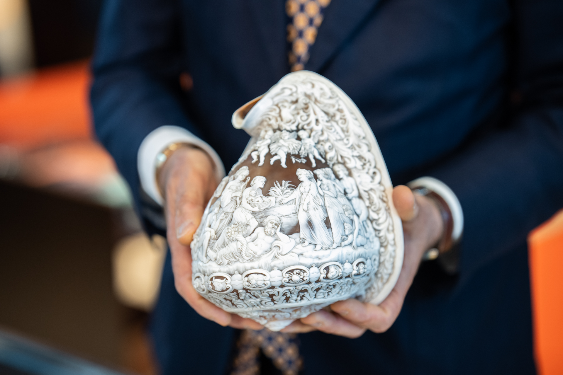 「このカメオは、私の祖父が当時のナポリの巨匠ジョヴァンニ・サッバートにオーダーし、彫られたものです。これまでメトロポリタン美術館やブリティッシュ・ミュージアム、京都国立博物館、そして駐日イタリア大使館などでも展示されてきた由緒ある作品です。ナポリの誇り、そして家族の歴史をこの万博という国際的な舞台で紹介できることを、とても光栄に思っています」