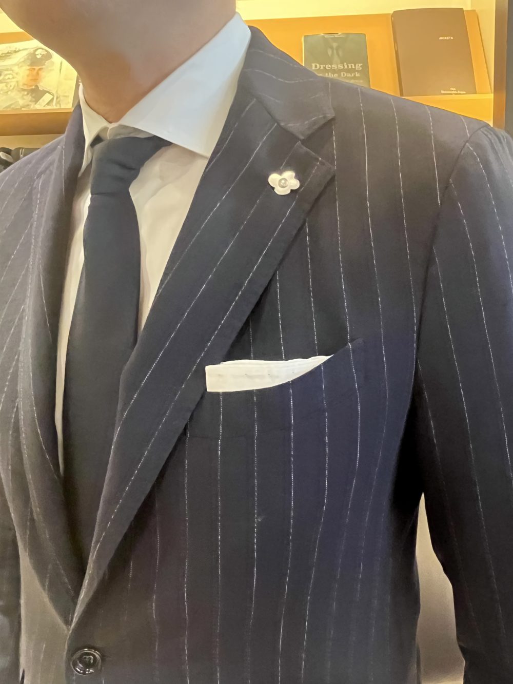 一方で、自社ブランド〈ラルディーニ〉は“柔らかなイタリアンテーラリング”の代名詞として世界的に認められる存在へと成長しました。象徴的なのは、現在もアイコンとして受け継がれる、かつてはフェルト製のみだったフラワーピン。