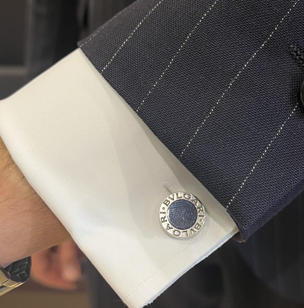 さりげなく光るカフスボタンも同じくブルガリ製。母国ブランドを愛し、人生の節目に身につける──それもまた彼の“敬意の表現”である。