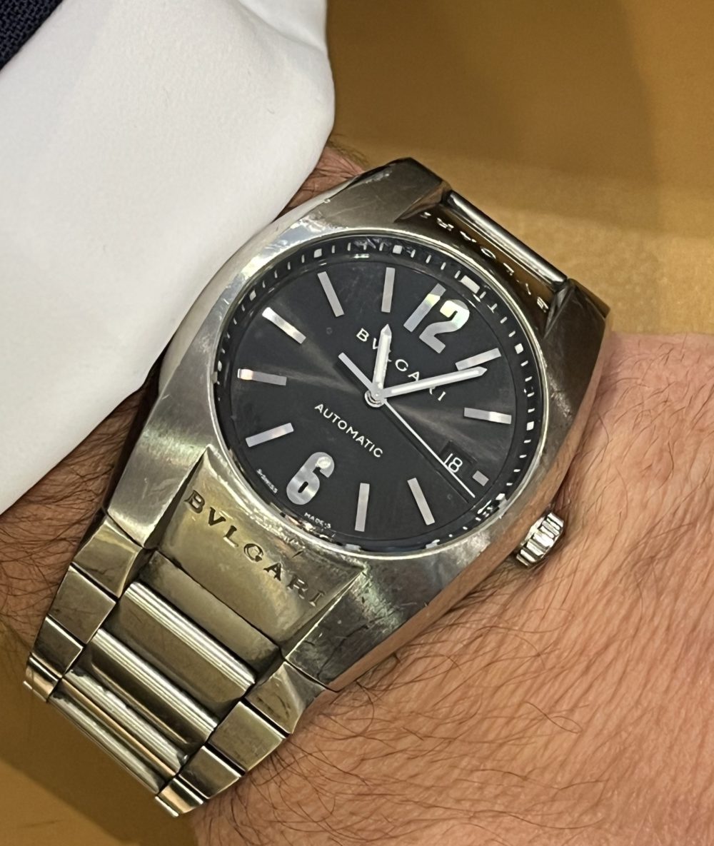 腕もとを飾るのは、奥様から贈られた〈ブルガリ〉の時計。長年にわたり大切に身につけるその姿には、エレガンスを超えた愛情が感じられる。