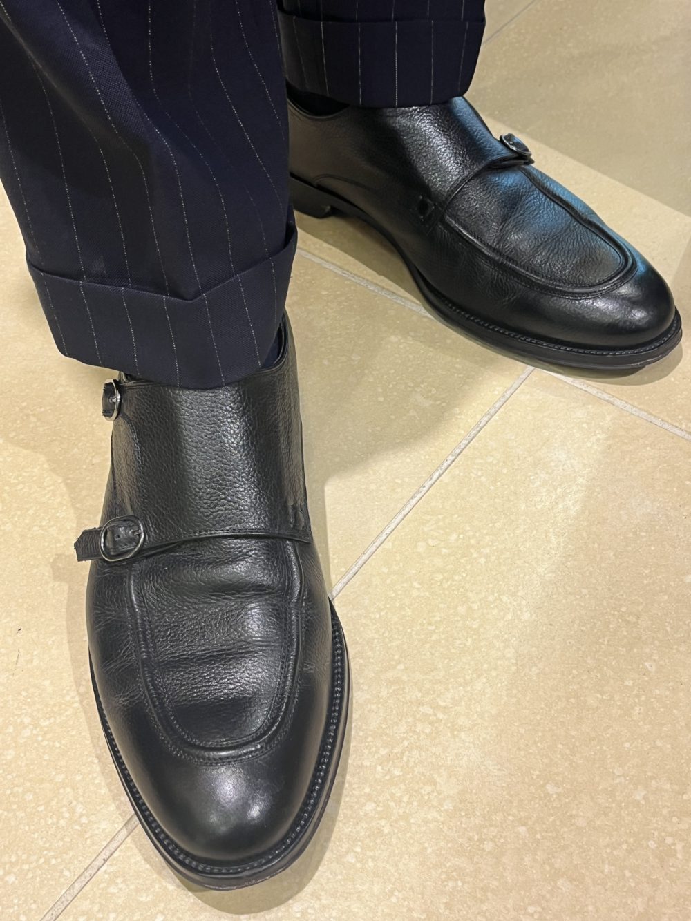 足もとはイタリアの名門〈ポリーニ〉のダブルモンクストラップ。クラシックの中に確かな個性を宿す選択。