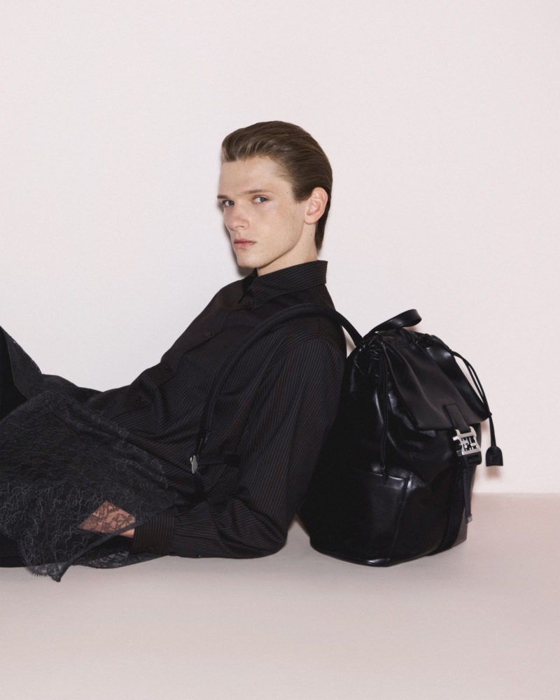 後者は内側にラップトップ専用コンパートメントを含む機能的なファブリックライニングを、外側にはレザーハンドル、「FF」ロゴディテールのドローストリングクロージャーを備えた、デザイン性と機能性を両立するバックパック。調整可能なストラップとパッド入りのウェビングは、快適な着用感を提供する。